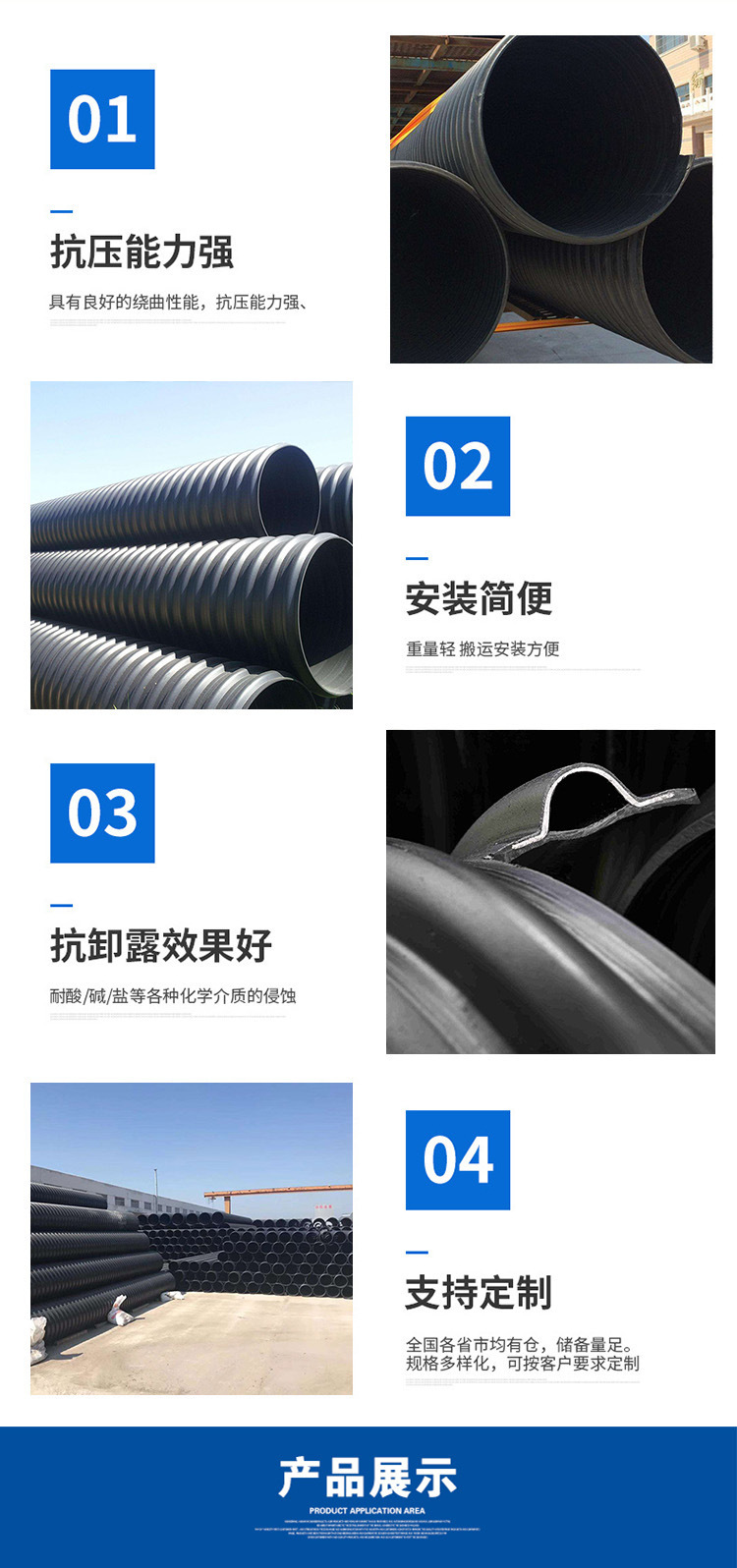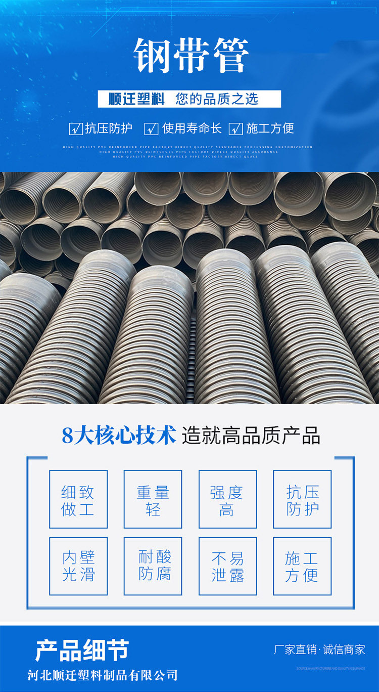 2、抗冲击:管材壁采用"U"字形结构,耐冲击、耐压,地基下沉情况下也不破裂,而且变形后复原性强,对地基都有很好的适应性;
