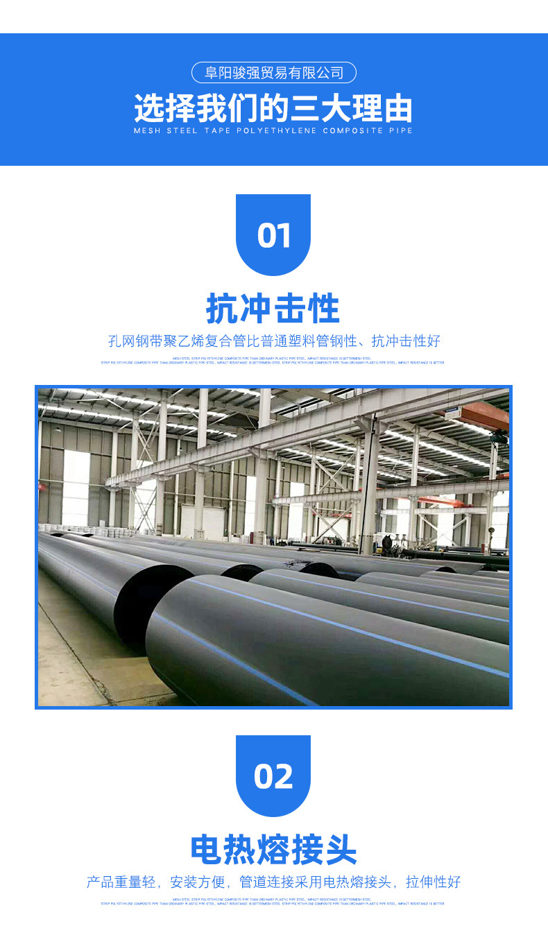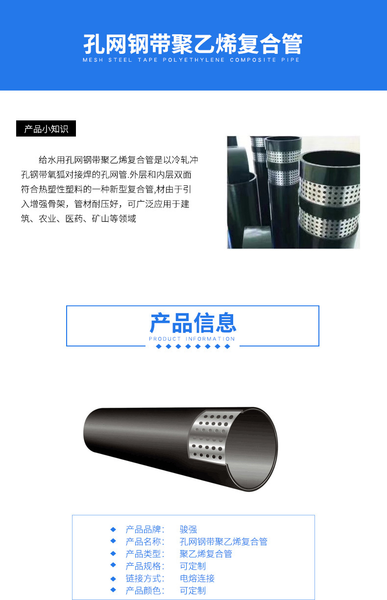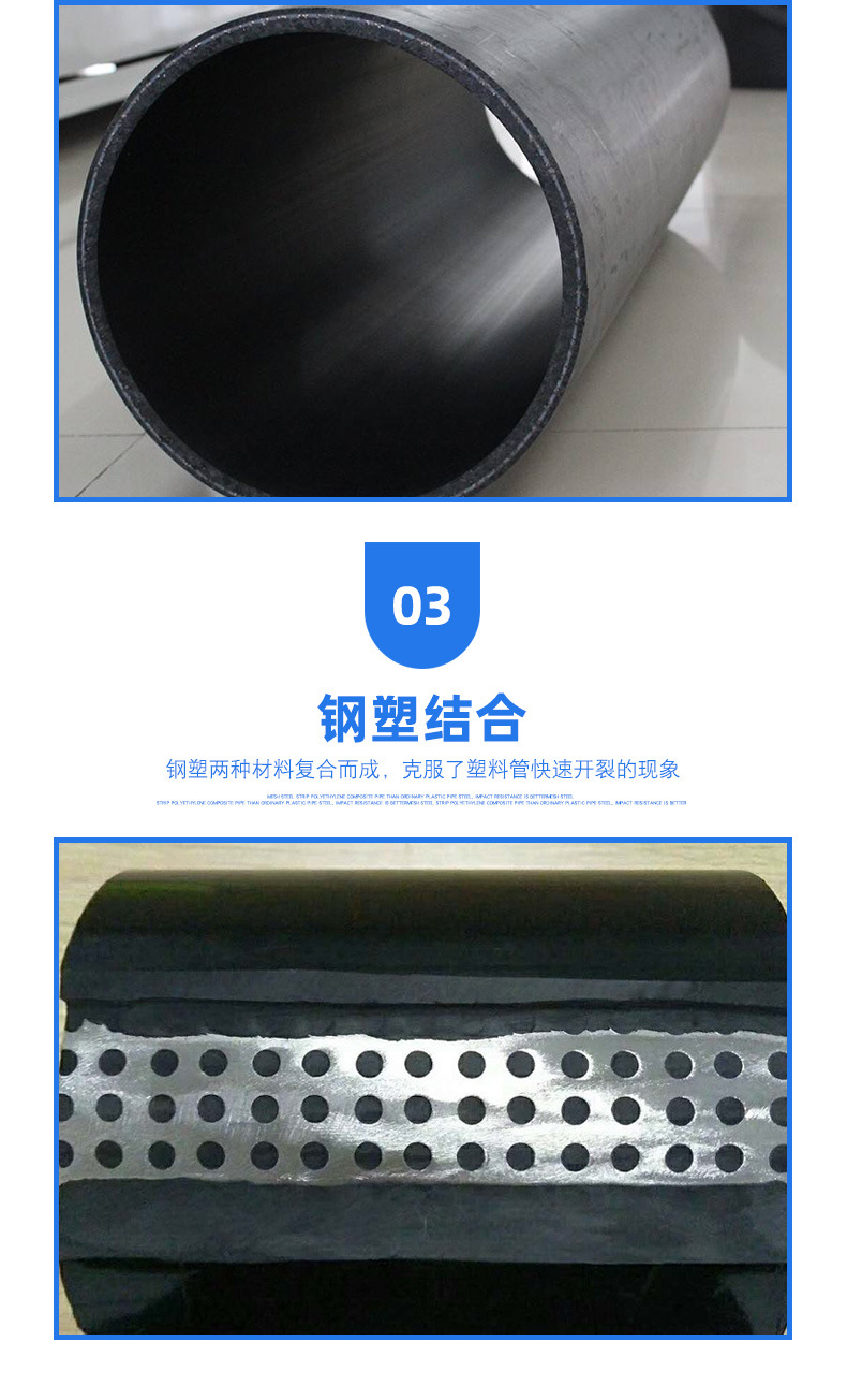 甘肃兰州孔网钢带复合管 消防工业高压给水管,孔网钢带复合管是由增强骨架与塑料相互包容成为一个整体,内外壁塑料层几乎不可被剥离,复合层内无粘接剂,作为管道连接无内外壁塑料与增强体剥离之忧。因此,这种复合管克服了钢管和塑料管各自的缺点,而又具有钢管和塑料管的优点。