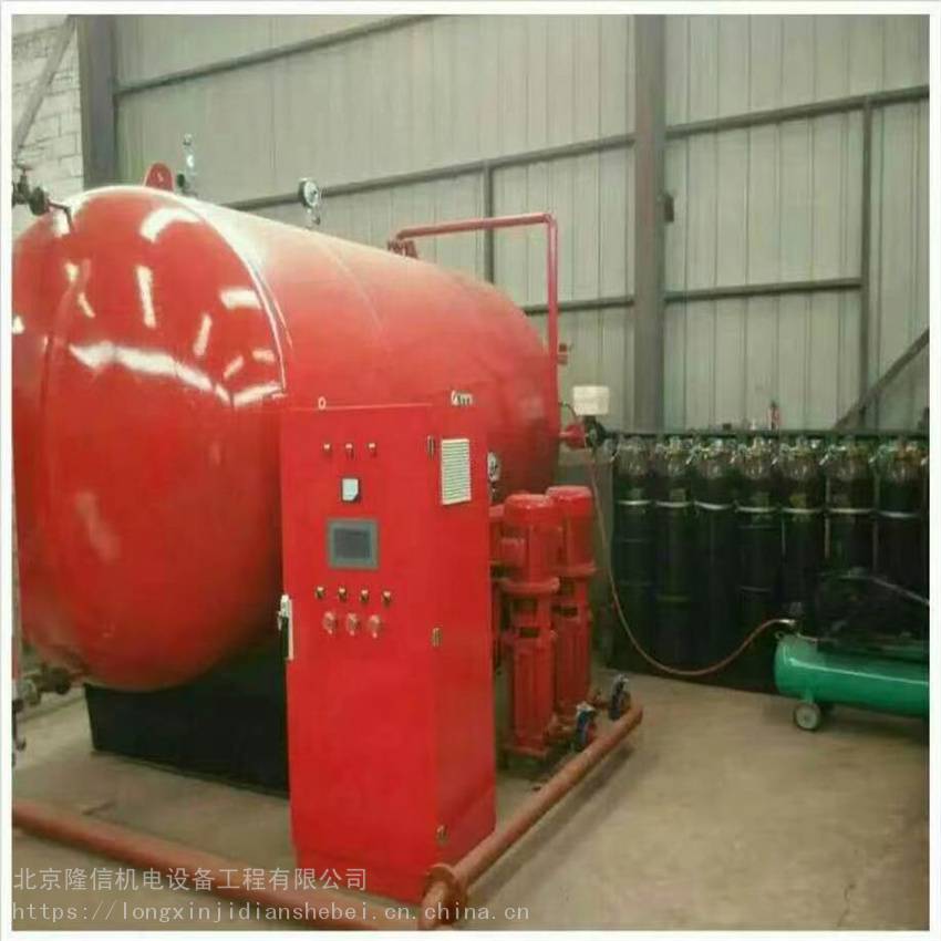 因此,消防气体顶压给水设备是替代高位消防水箱或普通气压罐而兼备高位消防水箱和普通气压罐二者功能非常理想的设备,也是目前大型应急消防气压给水新产品,在许多消防工程中也得到了实际应用。但是从目前在工程设计施工和实际应用中,我们认为对照我国现行相关建筑防火设 将一定的压力气体和消防用水贮存在密闭的钢制压力容器内,在水泵运行和非运行时间内均能向消防管网自动连续的供水。为避免消防主泵经常启动保压设置了一台小功率保压泵,保持消防管网压力。设备具有自动、手动、远控启停水泵,定期巡检功能,即使在停电情况下也可靠气体压力供出足量的有效水。广泛应用于各类公共及民用建筑,工矿企业及设施的消防用水系统