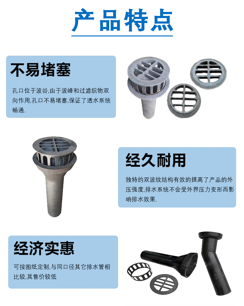 1.排水安全性:孔口位于波谷,波峰和过滤织物的双向作用使孔口不易堵塞,保证透水系统畅通。