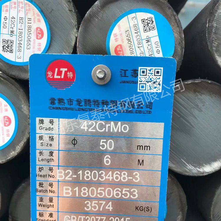42CrMo圆钢是超高强度钢,具有高强度和韧性,淬透性也较好,无明显的回火脆性,淬火时变形小,调质处理后有较高的疲劳极限和抗多次冲击能力,低温冲击韧度良好,高温时有高的蠕变强度和持久强度。该钢通常将调质后表面淬火作为热处理方案。
