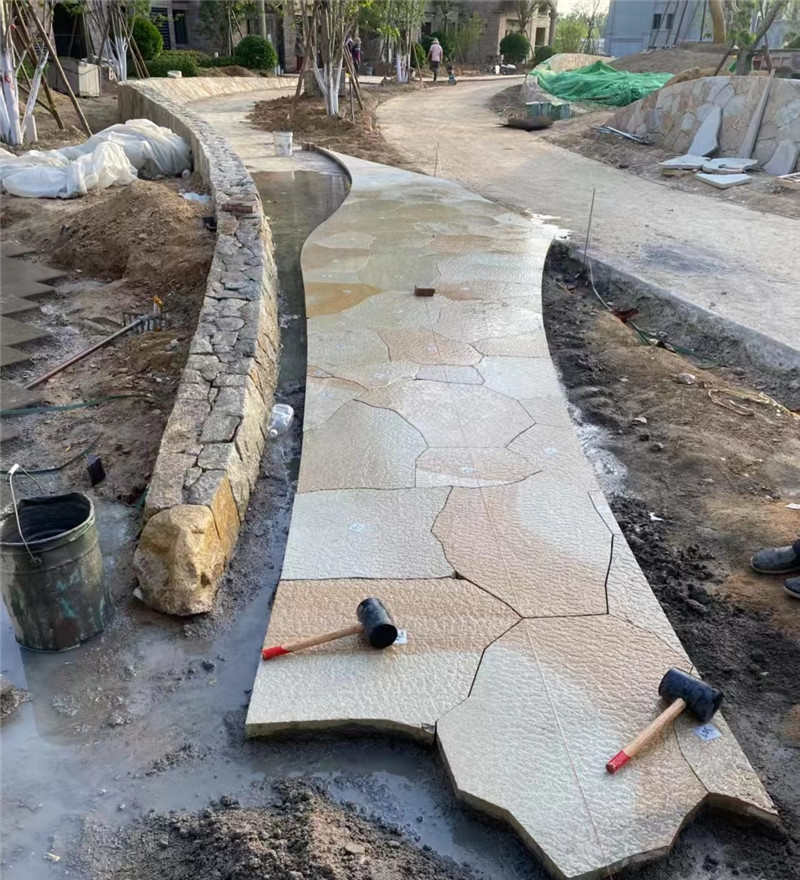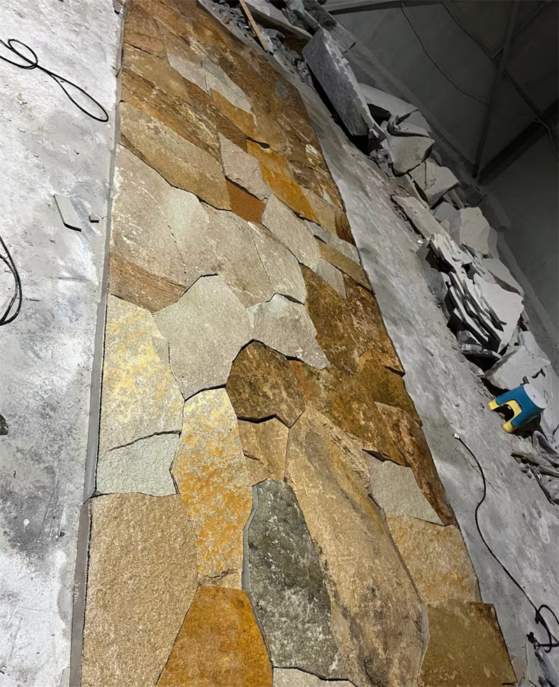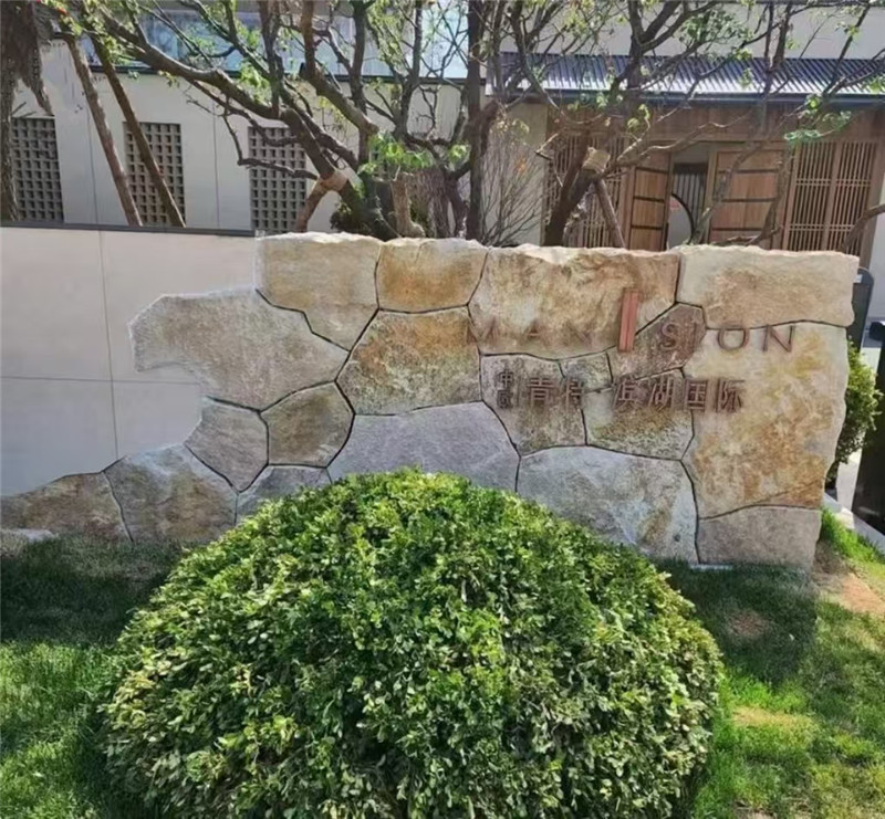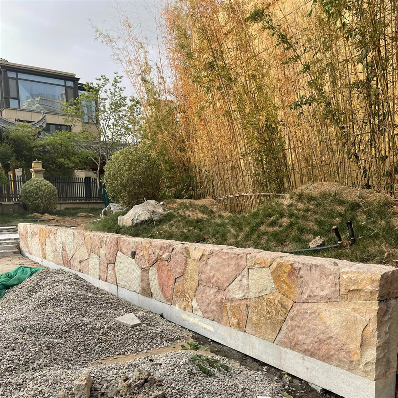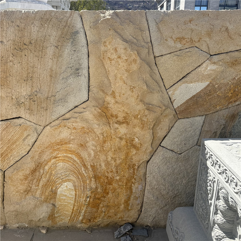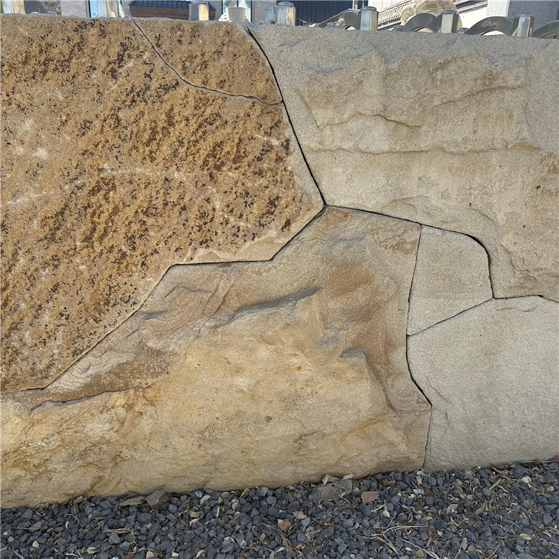 雕塑景墙 柏坡黄石皮墙文化石 黄色碎拼石 柏坡凰自然石头表面相对粗糙,不像抛光面那样光滑,这使得它具有良好的防滑性能。在潮湿的环境中,如卫生间、厨房或室外的庭院、泳池边等场所使用,能够有效降低滑倒的风险,保障人们的行走安全。柏坡黄自然面石材具有出色的耐久性,能够抵御风吹、日晒、雨淋等自然因素的侵蚀,不易褪色、风化或腐蚀。经过长期使用,依然能够保持其原有的色泽和质地,为建筑提供持久的装饰效果。可用于客厅、卧室、餐厅等空间的地面铺设,为室内营造出温馨、舒适的居住氛围;也可用于墙面装饰,无论是局部点缀还是大面积铺贴,都能为室内空间增添一份自然的韵味和高雅的气质。此外,还可用于楼梯踏步、窗台板等部位,既实用又美观。在建筑外墙的装饰中,柏坡黄自然面石材能够展现出建筑的庄重与大气,同时其良好的耐久性也能适应各种恶劣的户外环境。在园林景观设计中,可用于铺设庭院小路、建造景观墙、装饰花坛边缘等,与周围的自然环境相得益彰,营造出和谐统一的景观效果。