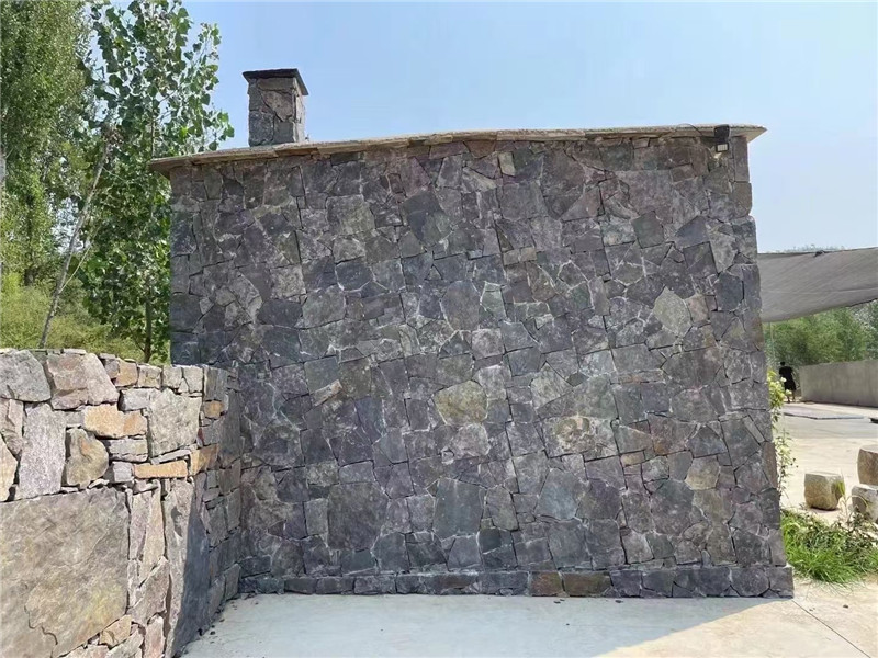 搭配技巧与养护要点是让不规则毛石片岩 “出彩不踩雷” 的关键。搭配上,需遵循 “自然协调” 与 “主次分明” 原则:色调上,毛石片岩的自然色系(深灰、墨绿、褐红)需与中性色搭配,避免高饱和色破坏自然氛围 —— 例如深灰毛石墙面前摆放浅灰色布艺沙发,地面铺原木色地板,软装选择白色棉麻材质,通过低饱和色强化原生质感;若想强化野趣感,可搭配藤编、粗陶、麻绳等原生态材质,或增加小型水景、苔藓微景观,进一步凸显 “自然属性”。排版上,铺贴时需完全遵循 “随机原则”,避免刻意对称或整齐排列,可让大小、形状不同的毛石片岩自然穿插,缝隙宽度保持 5-10mm 的随机变化,户外可用细砂填充,室内则用同色系勾缝剂,保留自然感的同时防止积灰。
