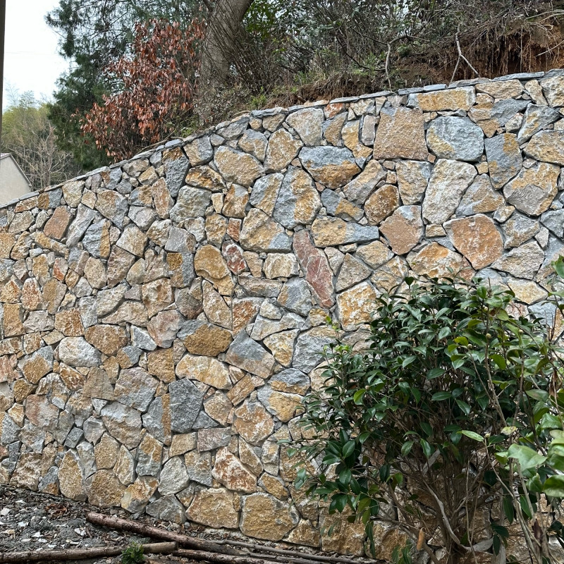 黄木纹冰裂纹 黄色蘑菇石外墙砖 现代景观 虎皮石碎拼石文化石以天然虎皮石为原料,经切割成不规则碎块拼接而成,核心魅力在于 “虎皮状斑纹” 与 “碎拼形态” 的双重融合 —— 既保留石材原生的斑驳纹理与坚韧质地,又通过无规律拼接传递 “源于自然、充满野性” 的活力,适配户外景观与室内个性空间,成为工业风、自然野趣风、新中式等设计的热门选材,让空间在独特斑纹中透着粗犷层次。