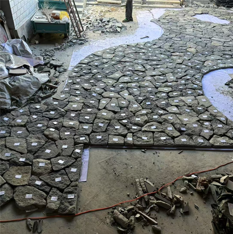 不规则园林地铺石材 禅意庭院 青石片乱石文化石 青黑色碎拼石是将天然青黑系石材经破碎筛选后,以不规则形态拼接而成的装饰材料,核心材质涵盖青石板、黑花岗岩、玄武岩等,石体呈现青灰至墨黑的自然渐变,表面带着原生节理纹路、凿击痕迹或流水冲刷质感,凭借“冷韵肌理+硬核质地”的双重优势,成为新中式、工业风、侘寂风等多元风格的热门选材。其核心价值在于用青黑色的沉稳特质平衡空间氛围,以碎拼的无序美学打破规整刻板,既保留天然石材的耐候耐用属性,又以丰富肌理传递自然张力,让地面、墙面等装饰部位从“功能性载体”升为“空间记忆点”,适配从家居庭院、玄关到商业景观、文创空间的全场景需求。青黑色碎拼石的独特魅力,源于“材质天赋”与“拼贴艺术”的双重赋能。原料层面,青石板碎拼石层理清晰,青灰底色中隐现深色纹理,触感温润且耐潮抗腐,适合潮湿环境;黑花岗岩碎拼石硬度最gao(摩氏6-7级),抗压强度超100MPa,耐风化、抗冻融,是户外高频使用场景的刚需之选;玄武岩碎拼石则以致密结构著称,墨黑底色纯粹均匀,表面气孔肌理独特,适合打造个性景观。加工上仅对破碎后的石材做边缘轻度钝化,避免尖锐棱角,保留自然面的粗糙质感,每一块石体的大小、形态、纹路都独一wu二,为拼贴创作提供了天然素材。在风格表达与场景应用中,青黑色碎拼石的适配性极强。新中式庭院的小径用青石板碎拼石铺地,石缝间填充细沙与苔藓,搭配竹影、假山与跌水,冷韵石面与东方禅意相融,营造出“踏石寻幽”的雅致意境;工业风客厅的电视背景墙用黑花岗岩碎拼,粗糙凿痕与裸露管线、金属家具呼应,局部嵌入红色装饰画,青黑色基底让亮色更显突出,强化空间的粗犷张力;侘寂风卧室的床头墙面,用浅青灰碎拼石局部点缀,石面温润质感与亚麻软装、原木地板搭配,传递宁静厚重的休憩氛围。商业空间里,文创书店的地面用不同深浅的青黑色碎拼石拼接成几何图案,搭配暖光射灯与旧书架,成为兼具文艺感与互动性的打卡点;网hong咖啡馆的吧台立面用玄武岩碎拼,表面气孔肌理与水泥台面、复古海报搭配,冷调石面与暖光灯泡形成对比,自带故事感;高duan餐厅的包间背景墙用青石板与黑花岗岩交错碎拼,冷硬肌理与红木家具平衡,提升用餐空间的雅致格调。施工环节需兼顾“稳固性”与“美学感”,核心在于细节把控。基层处理需坚实平整,户外地面需铺设15-20cm厚碎石垫层与8cm水泥砂浆找平层,夯实后承载力达25MPa以上;室内墙面需凿毛并涂刷界面剂,轻质隔墙必须增设18mm厚木工板或角钢加固,防止石材重量导致变形。铺贴前需现场预铺,按石材颜色、大小分类组合,大块石体铺于受力区域,小块石体填补缝隙,确保视觉协调;采用“胶黏+干挂”双重固定,墙面用石材专用胶涂抹,每块石材背后胶层厚度3-5mm,大规格石块需用不锈钢挂件辅助固定,确保每平方米不少于4个受力点。石缝宽度控制在1-1.5cm,选用与石材同色的环氧美缝剂,或用细沙填充强化自然感。养护管理需针对青黑色石材特性,重点做好“防污+防刮”。日常清洁用软毛刷或湿拖布清理表面灰尘即可,避免用硬毛刷或高压水枪冲洗,防止划伤石面肌理;沾染油污等顽固污渍后,用中性清洁剂湿敷10-15分钟轻轻擦净,禁用强酸强碱药剂,防止腐蚀石材表面导致色差。户外使用的碎拼石每2-3年涂刷一次渗透型防护剂,增强抗污性与抗风化能力;北方地区冬季需清理积雪,避免冻融循环破坏石材结构。相较于规则石材,青黑色碎拼石的野趣肌理更具艺术张力;相较于彩色石材,其冷韵色调更显沉稳百搭;相较于人造石材,其天然质感与耐用性更优。无论是打造温馨家居的个性装饰,还是构建商业空间的记忆点,青黑色碎拼石都能以“冷韵肌理+实用性能”的核心优势,成为提升空间格调的理想选材,用每一块石材的自然印记,为空间注入独特的温度与艺术魅力。