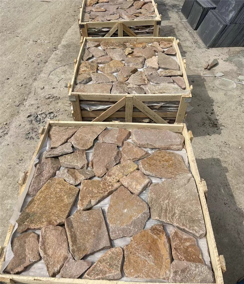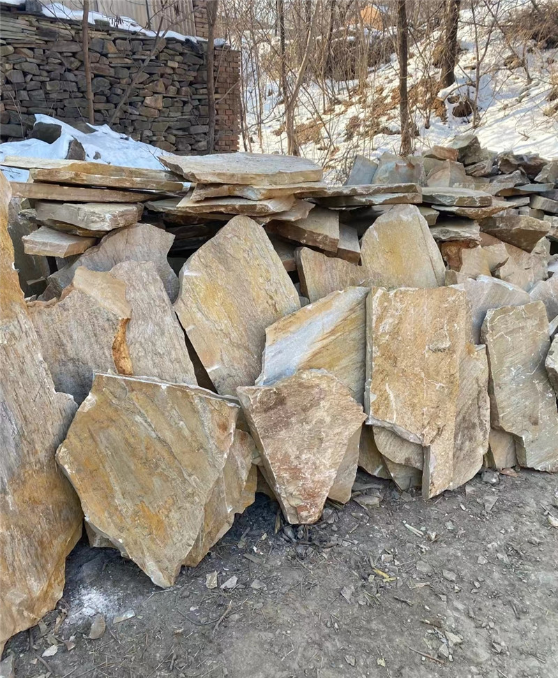 虎皮黄蘑菇石 简约线条背景墙 自然肌理 不规则黄木纹板岩碎拼石 每块碎拼石都有独特的形状、纹理和颜色,拼接后能呈现出自然多变的效果,为空间增添独特的艺术氛围。表面不平整,具有一定的防滑作用,适用于户外步行道、庭院等需要防滑的场所。碎拼石之间存在缝隙,有利于空气和水分的流通,用于地面铺装时,可使地面下的土壤保持透气和透水性。常见的有青石板、花岗岩、板岩、砂岩等,不同材质的碎拼石在硬度、质感和耐久性等方面有所差异。可用于公园、植物园、旅游景区等的步行景观路、园路、广场节点的铺装,也可用于堆砌景墙、花池等。适合庭院地面、露台、小径的铺装,与周围的花草树木等自然元素相融合,营造出自然、舒适的庭院氛围。用于建筑外墙的装饰,可打造出自然粗犷或古朴典雅的建筑外观,为建筑物增添独特的魅力。