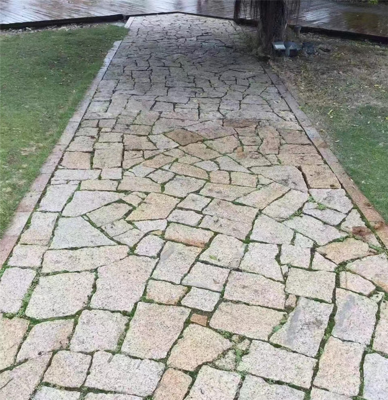在空间应用中,黄锈石碎拼石的铺砌方式赋予空间不同的气质。园林中常用 “冰裂纹” 拼法,碎块间的缝隙宽窄不一,如同湖面结冰后的自然裂纹,与周边的草坪、水景、绿植搭配,行走其上仿佛踏过山间的天然石径,锈黄色的石面在绿色背景中格外醒目却不突兀;日式庭院则偏爱 “散点式” 铺设,将大小不一的黄锈石碎块随意嵌入碎石垫层,石面与地面平齐,缝隙间长满青苔,营造出 “枯山水” 的禅意,锈色与苔藓的青绿色形成古朴的色彩对话。