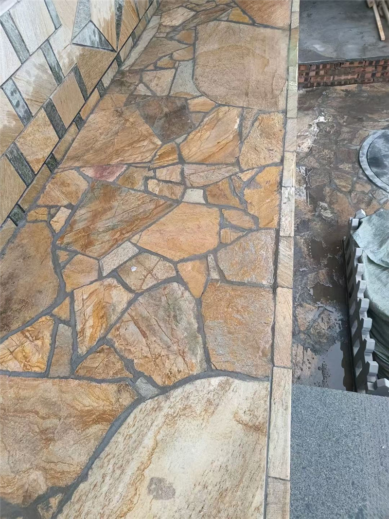 养护方面,黄锈石碎拼石因其坚硬的质地相对省心,日常只需定期清扫表面落叶、灰尘,避免尖锐物体划伤即可。若长期暴露在油污较多的区域(如厨房外廊),可用中性清洁剂刷洗,切忌使用酸性溶液,以免腐蚀石材表面、破坏锈色纹理。对于缝隙处的杂草,可人工拔除或用高压水枪清理,无需频繁使用化学除草剂,以保持石材的天然质感。这种无需过多干预的特性,恰好契合了黄锈石碎拼石所传递的自然、质朴的生活态度,让每一块石材在时光中静静展现岁月的魅力。