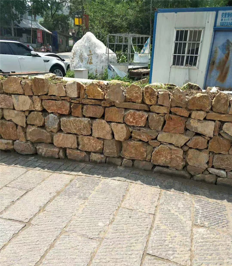 在场景应用中,黄锈色垒墙石凭借粗犷肌理,成为室内外空间的 “复古焦点”。室外场景里,它是打造乡村与工业风格景观的理想材料:用于庭院围墙垒砌时,选用大小错落的黄锈色垒墙石,按 “干砌法” 或 “湿砌法” 施工(干砌保留自然缝隙,湿砌用浅灰色水泥砂浆勾缝),搭配原木栅栏、藤本月季与石灯笼,石材的锈色与绿植的生机相映,营造 “乡村小院” 的温馨野趣感,且花岗岩材质耐候性强,长期使用不易褪色;用于工业风民宿的外立面局部装饰,采用黄锈色垒墙石铺贴墙面基座或腰线,与深灰色水泥涂料、黑色金属门窗搭配,锈色的复古与工业元素的冷硬碰撞,传递 “复古工业” 的个性氛围;若作为别墅庭院水景挡土墙,选用厚板黄锈色垒墙石(厚度≥100mm),按 “错缝垒砌” 工艺施工,墙体表面预留排水孔,既能阻挡土壤流失,又能通过锈色与水景的搭配,还原 “自然水岸” 的原始意境,适合私人别墅、gao端民宿的室外装饰。