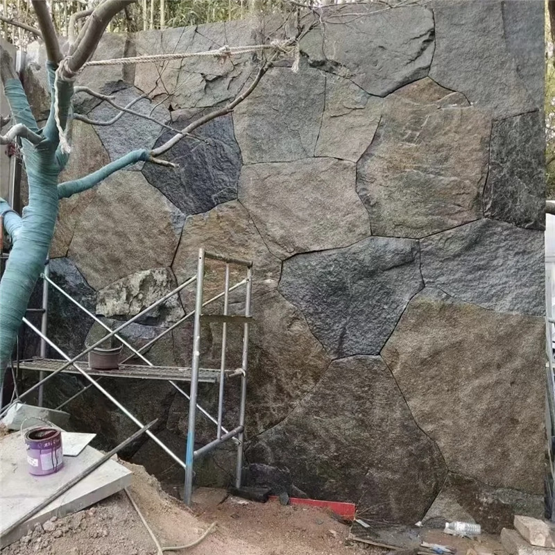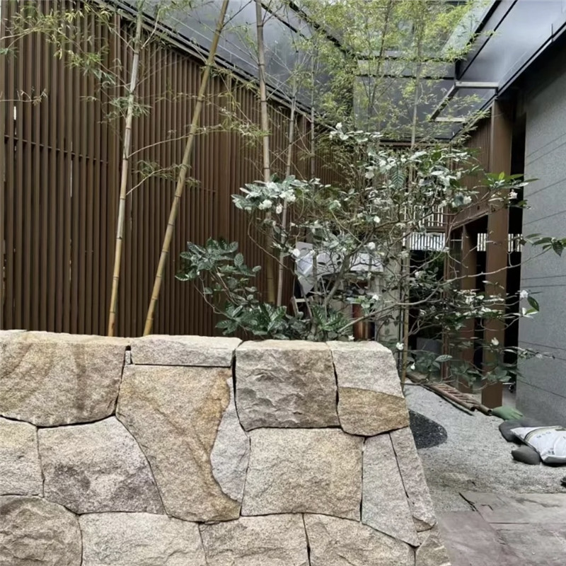 施工工艺上,石皮墙文化石讲究 “贴附式美学”。基层处理需平整洁净,先涂刷界面剂增强粘结力,再用专用石材胶将石皮逐片粘贴,拼接时通过错缝排列让纹理自然延续,或故意制造纹路转折形成视觉焦点。石缝处理灵活多元:密缝铺贴让墙面呈现整体岩石感,适合现代简约风格;宽缝勾填青灰砂浆则凸显线条韵律,适配中式庭院;甚至可保留缝隙不填充,让藤蔓植物从石缝中自然生长,打造生态立体景观。