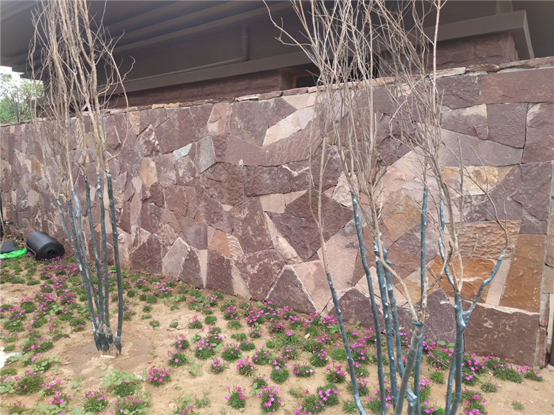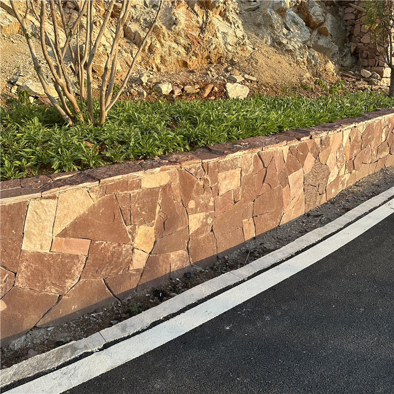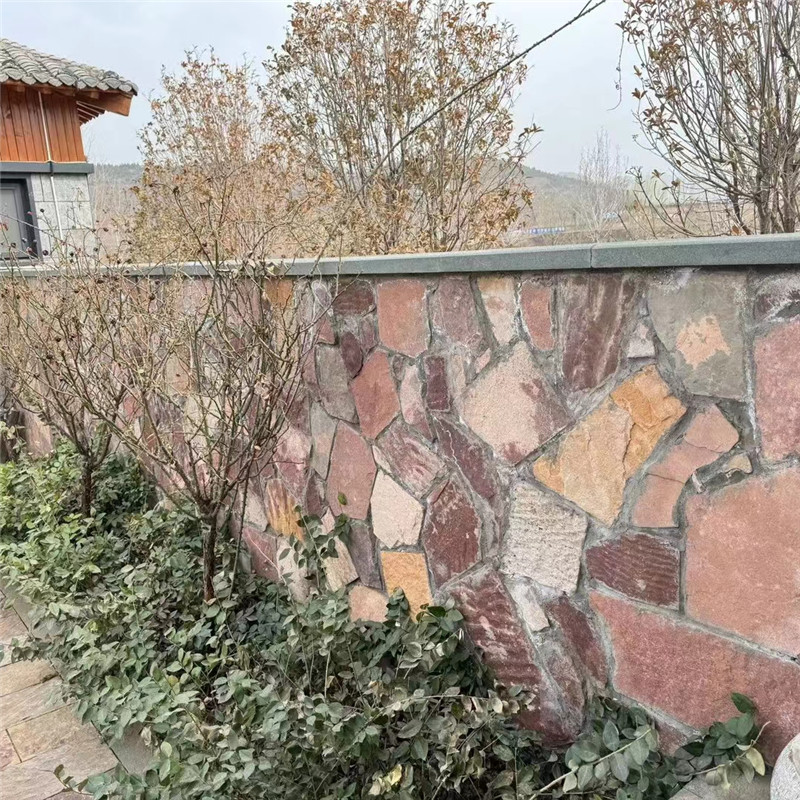 高粱红冰裂纹文化石 墙面装饰 天然红色碎拼石 景观毛石贴墙石以天然毛石为原料,经简单切割修整形成适配墙面铺贴的形态,核心魅力在于 “原生粗犷肌理” 与 “景观适配性” 的双重融合 —— 既保留毛石的自然野趣,又通过贴墙设计强化空间的景观层次感,适配庭院景墙、公园景观墙、民宿外墙等户外场景,成为新中式、自然风、乡村风等设计的热门选材,让户外空间在原始质感中透着设计巧思。