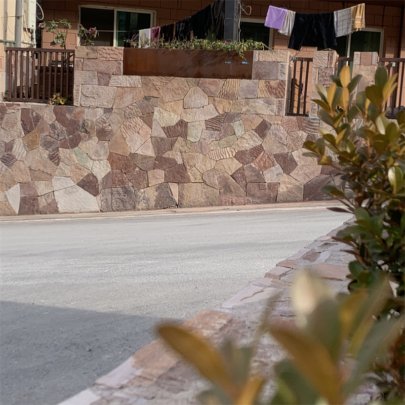 场景应用中,景观毛石贴墙石的 “原生形态” 与 “景观适配性” 可针对性发挥,覆盖户外多元需求。在庭院场景里,用浅灰色花岗岩毛石贴墙石砌筑 1.2-1.5m 高的景墙,墙面预留不规则镂空,既隔绝视线又保留景观互动,镂空处搭配迎春或凌霄花,让景墙成为 “可呼吸的景观隔断”;庭院休闲区周边用土黄色砂岩毛石贴墙石搭建矮墙,作为花池边界,内部种植月季、绣球等花卉,外侧铺设青石板步道,搭配户外实木桌椅,营造 “围合式” 自然休憩空间。在公园与景区中,公园步道两侧用深褐色石灰岩毛石贴墙石铺贴矮墙,高度控制在 30-50cm,既防止行人踩踏草坪,又以毛石肌理提升步行舒适度;景区入口处用不同色调的毛石贴墙石拼贴成艺术景墙,中间嵌入景区标识,搭配两侧对称的绿植,成为游客打卡的视觉焦点。在民宿与乡村改造中,民宿客房窗外用毛石贴墙石铺贴墙面,搭配绣球花与木质秋千,毛石的原始质感与民宿的 “自然旅居” 理念呼应,让客人推窗即可见野趣;乡村改造项目中,村口文化墙用毛石贴墙石砌筑,墙面雕刻乡村文化符号,搭配红灯笼与木质牌匾,既保留乡村的历史记忆,又成为展示乡土文化的窗口。