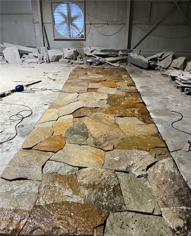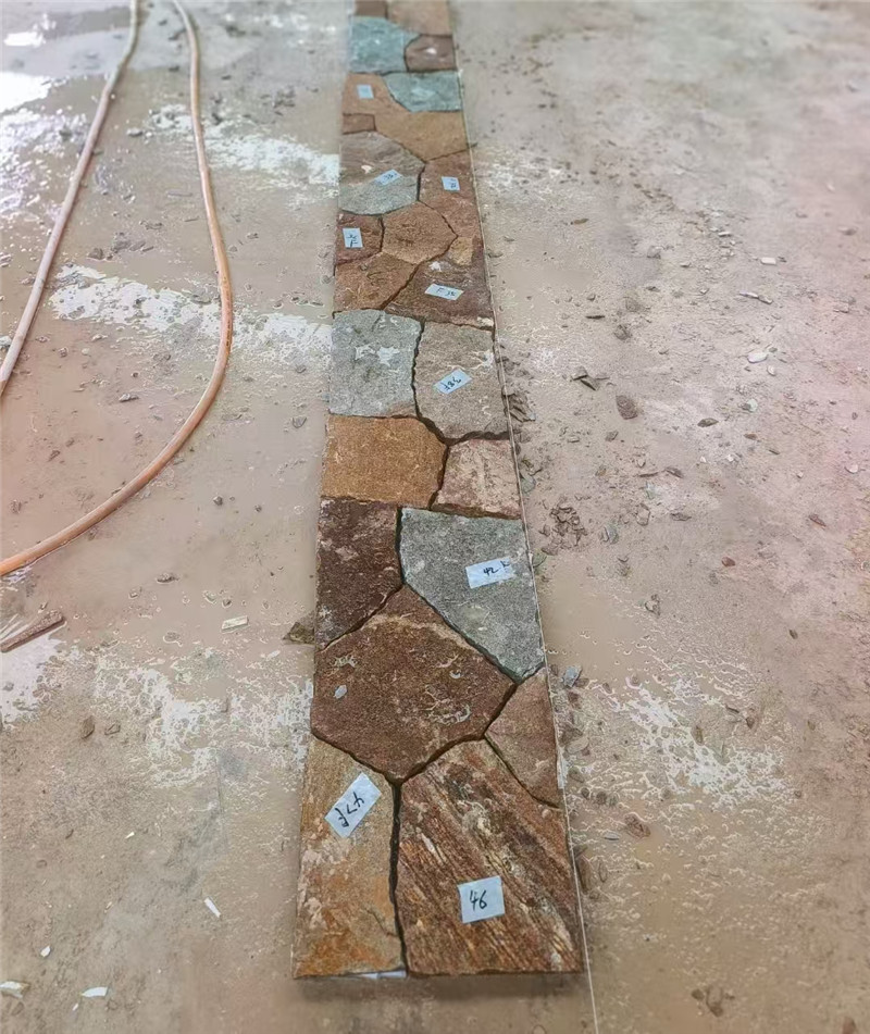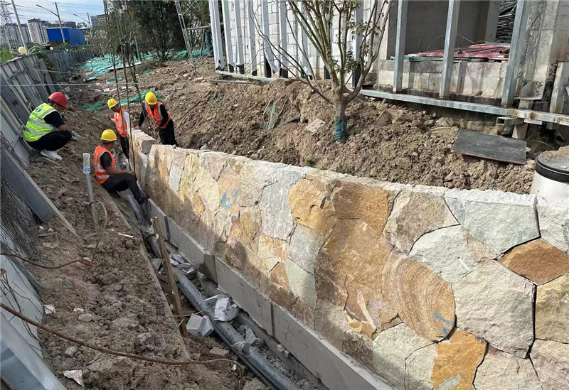 - 留缝处理:不规则石材通常采用留缝式铺贴,片与片之间搭配合理,留缝控制在8-10mm,严禁出现最小边小于50mm规格石材、尖锐角。