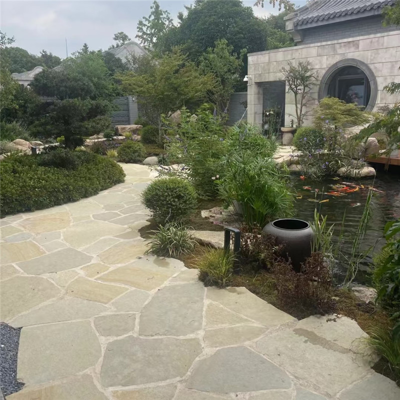 在场景应用中,不规则板岩凭借层理肌理,成为室内外空间的 “自然调味剂”。室外场景里,它是打造乡村与自然风格景观的理想材料:用于庭院步道时,选用深浅灰相间的不规则板岩,按 “随形铺贴” 工艺铺设,缝隙填充浅灰色细砂或种植苔藓,搭配原木栅栏、藤本月季与石灯笼,石材的层理纹与庭院的自然氛围相融,营造 “山野小径” 的野趣感,且防滑性能优异,雨天行走不易打滑;用于乡村民宿外墙局部装饰时,采用褐红色不规则板岩干挂铺贴墙面基座,搭配白色外墙涂料、原木门窗与悬挂式粗陶花盆,暖调石材与质朴元素碰撞,传递 “田园民宿” 的温馨感;若作为庭院水景驳岸,将深灰色不规则板岩沿水岸线堆叠,保留自然缝隙,水流漫过表面时,层理纹能折射柔和光影,搭配水生植物,还原 “自然水岸” 的灵动意境。