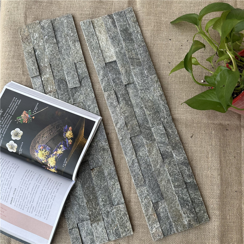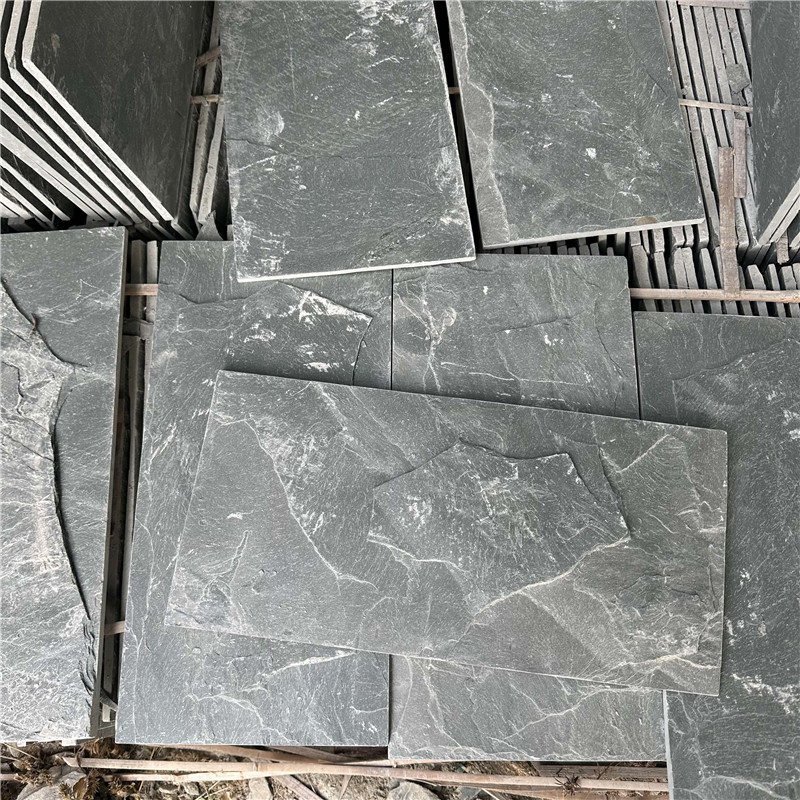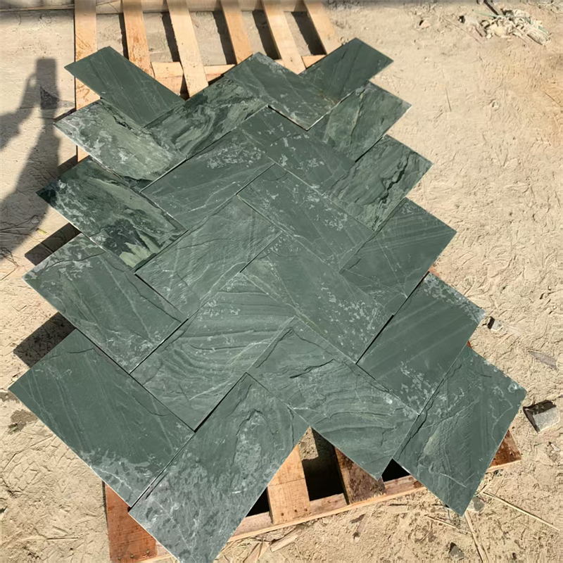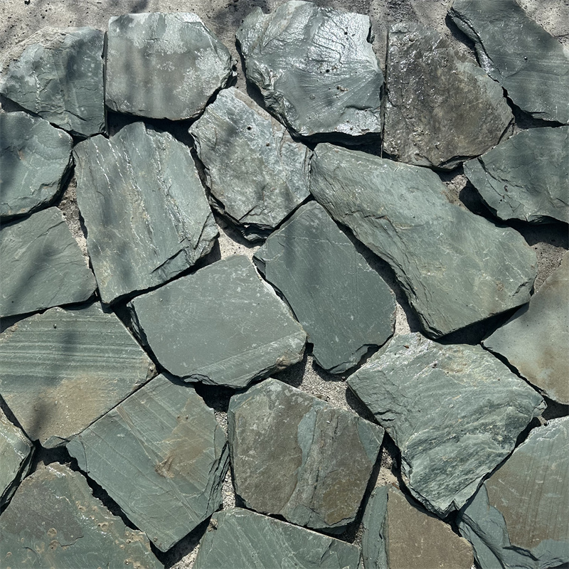 绿石英蘑菇文化石 卧室墙面 绿色冰裂纹碎拼石 天然青石板是一种以沉积岩中的板岩或砂岩为原料的天然石材,因色泽呈青灰、墨绿或藏青色而得名,兼具古朴质感与耐用属性,是建筑装饰中兼具功能性与美学价值的经典材料。其原生岩性致密(密度 2.6-2.8g/cm3),莫氏硬度可达 6-7,表面带有自然形成的细密纹理,或呈层状剥落的片状肌理,或含深浅不一的矿物斑点,单块板材尺寸从 30×60cm 到 100×200cm 不等,厚度多为 2-5cm,未经刻意打磨的表面保留着粗粝的原始触感。