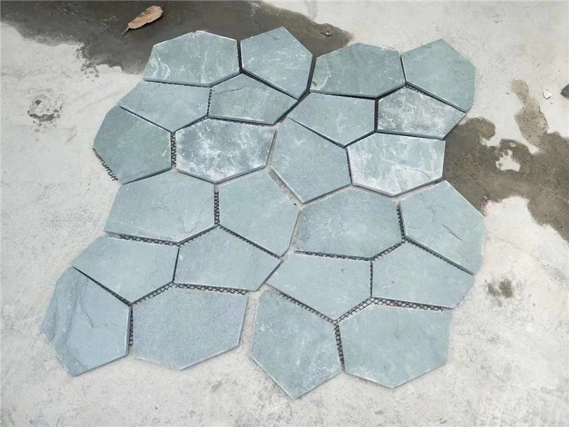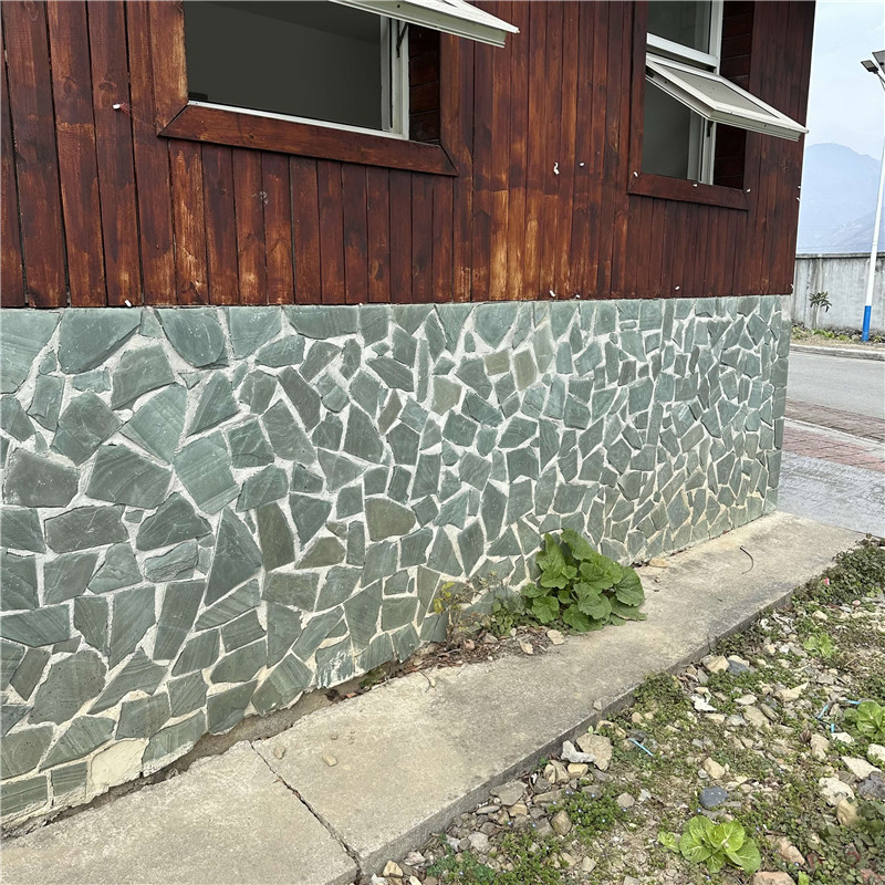 绿色冰裂纹碎拼石的优势显著:天然石材的耐候性强,能适应户外温差与雨水冲刷,尤其适合湿润环境;表面粗糙的纹理具有良好的防滑性,湿滑状态下摩擦系数仍可达 0.6 以上,安全性优于抛光石材;绿色调自带生命力,能与植物、水体等自然元素无缝融合。应用场景广泛,户外可用于庭院步道、泳池周边、水景驳岸,搭配水生植物或白色鹅卵石,营造 “苔痕上阶绿” 的诗意氛围;室内则适合作为浴室墙面、玄关地面,与原木家具或金属线条搭配,平衡自然质感与现代简约风格,在民宿、茶室等空间中更能凸显宁静禅意。
