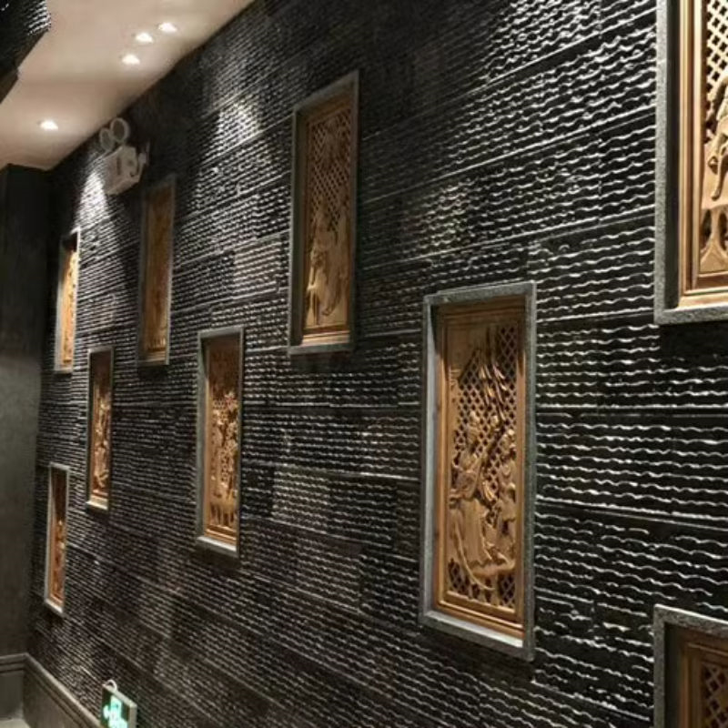 室内空间里,黑色蘑菇石是打造个性氛围的点睛之笔。客厅的电视背景墙用黑色蘑菇石错缝铺贴,搭配浅灰色布艺沙发与暖光射灯,石面的阴影在灯光下形成流动的纹路,仿佛将室外的山林气息引入室内;茶室的墙面局部镶嵌黑色蘑菇石,与原木茶桌、粗陶茶具相映,玄黑的石质衬托出茶汤的琥珀色,营造出 “茶禅一味” 的宁静氛围。卫生间的淋浴区墙面采用黑色蘑菇石,其防滑的表面与耐水特性完美适配潮湿环境,搭配白色洁具与绿植,黑白对比中透着自然的生机。