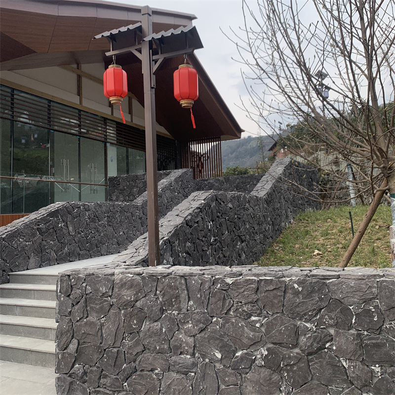 建筑外立面装饰中,黑色蘑菇石以强烈的质感对比塑造独特风格。新中式别墅的门头用黑色蘑菇石砌筑,敦实的石体与木质格栅、铜制门环搭配,玄黑的沉稳与木色的温润形成视觉平衡,彰显出低调而厚重的东方底蕴;现代风格的商业建筑局部镶嵌黑色蘑菇石,与玻璃幕墙的通透、金属线条的冷冽碰撞,粗犷的石质为极简空间注入野性张力,夜晚灯光从石缝中透出,如同黑暗中闪烁的星火,极具辨识度。