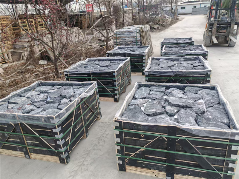 宠物庭院 青黑色碎拼石 水幕墙流水墙 黑色蘑菇文化石以其如暗夜中绽放的菌菇般的独特形态,在景观与建筑中勾勒出神秘而厚重的美学边界。这种石材因边缘向外翻卷如伞盖、石体敦实如菌柄而得名,天然的玄黑底色上,或点缀着灰白斑纹,或密布着细密的凿痕,表面的凹凸肌理仿佛是岩浆冷却后的凝固,又似暴雨冲刷过的岩石,每一块都带着原始的粗犷与岁月的沉静。