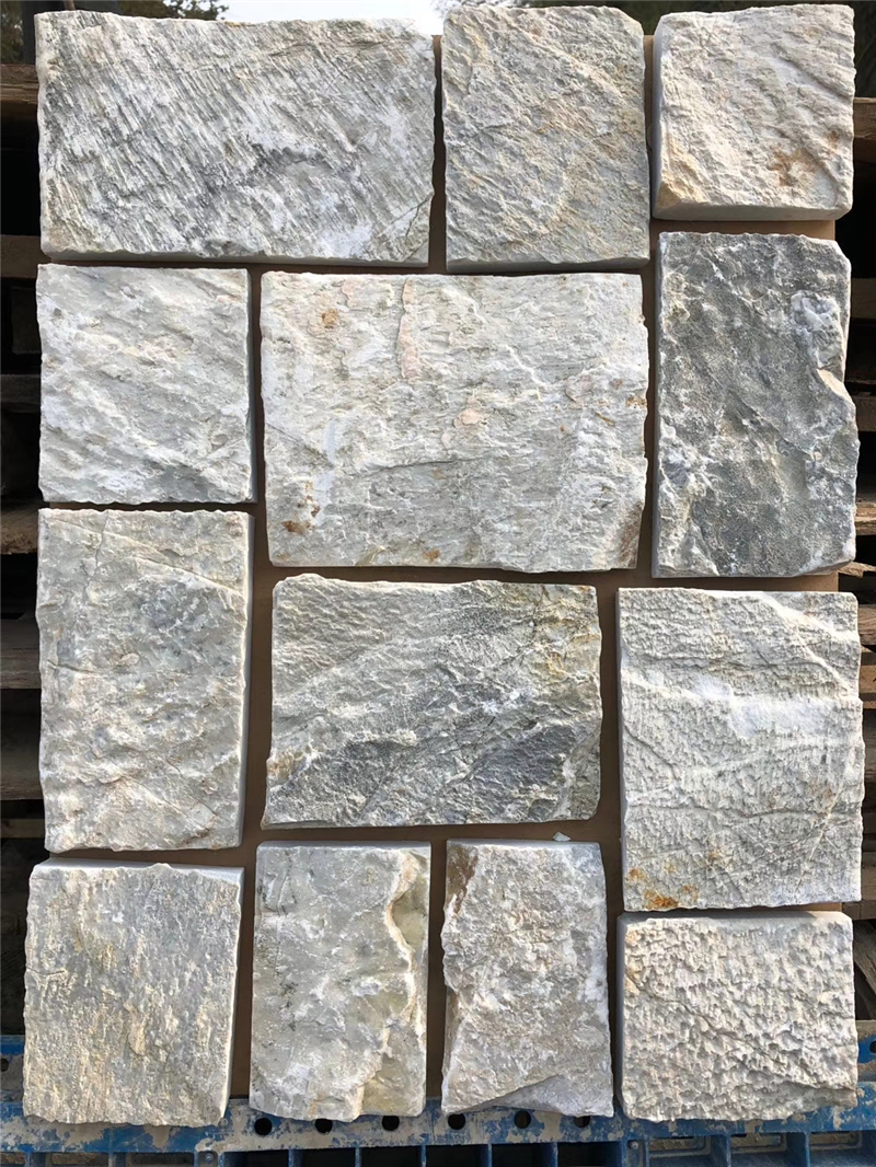 立面建设 古堡灰文化石 太行灰蘑菇碎拼石 不规则片石用于外墙底层或全墙铺贴,搭配铁艺栏杆、木质百叶窗,打造 “古堡式” 庄园风格;现代建筑中可局部点缀(如门廊、窗台下方),增加层次感。咖啡馆、书店等场所使用,搭配暖黄色灯光,营造文艺、静谧的氛围;复古主题酒店外墙采用做旧款不规则片石,强化历史感。作为电视墙或沙发背景墙,搭配金属线条、皮质家具,平衡工业风的冷峻与温馨感;或与木质元素(如胡桃木护墙板)结合,展现自然与复古的碰撞。小面积铺贴于餐边墙或吧台立面,搭配仿古砖地面,适合地中海、乡村等风格。用于分隔空间或装饰花池、水景周边,搭配绿植(如藤蔓植物、松针类灌木),营造自然野趣的花园氛围。与鹅卵石、石板路结合,铺设不规则的古堡灰文化石碎块,打造 “原生态” 步行道。墙面需平整、坚固,清除浮灰、油污;若为新砌墙体,需养护至少 14 天,确保含水率<10%。外墙施工建议先做防水涂层(如 JS 防水涂料),避免雨水渗入导致文化石脱落。