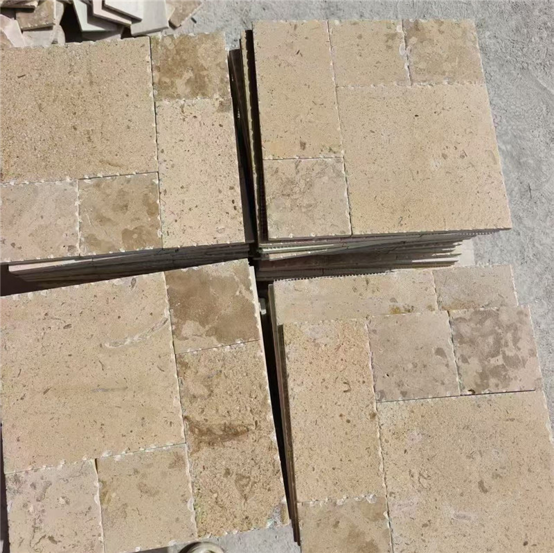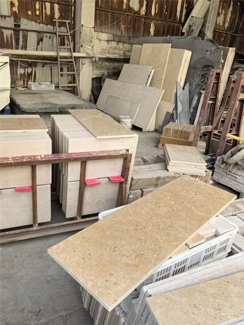 从外观来看,米黄色莱姆石的色调极为温润,从浅米黄到深蜜黄渐变,其间点缀着浅灰或褐色的天然纹理,有的呈细密的直线层理,有的则是不规则的云状斑块,整体呈现出柔和的哑光质感,避免了强光反射带来的视觉压迫。根据表面处理工艺,可分为哑光面、仿古面、荔枝面等:哑光面适合现代简约空间,凸显色彩纯粹;仿古面经做旧处理,纹理更显沧桑,适配复古风格;荔枝面则表面粗糙带颗粒感,多用于户外防滑场景。