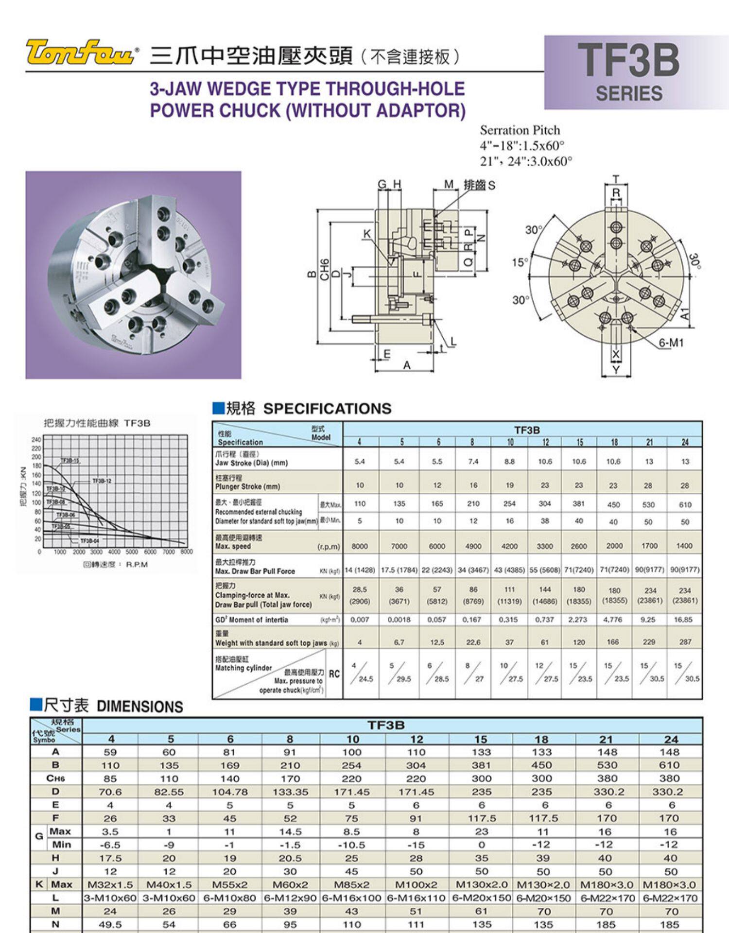 台湾卡盘TONFOU-TF3B-08-10通福8寸10寸三爪中空液压卡盘规格图