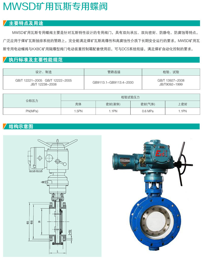 WSD94F-Q瓦斯阀,矿用瓦斯电动蝶阀,矿用瓦斯阀价格,高瓦斯煤矿都有新建瓦斯抽排和瓦斯发电厂,在以往的设计建设中,大都采用常规阀门,如闸阀、硬密封或软密封蝶阀等。闸阀和硬密封蝶阀在开关阀门时容易碰撞产生火花,铸钢件和普通橡胶密封件防腐性能差,阀门开关时铸钢件与橡胶摩擦易产生静电。由于瓦斯利用是个新兴行业,目前市场上还没有一种针对瓦斯特性设计的阀,无法满足瓦斯高爆性和高腐蚀性介质下长期安全运作要求,给瓦斯综合利用带来不安全因素。WSD94F-Q瓦斯阀,是根据瓦斯的特性和公司多年生产阀门的经验,开发出的新型、防静电、防腐蚀的瓦斯阀,已在全国多家大型矿业集团的几十家瓦斯电厂和瓦斯抽排系统中应用,安全可靠、备受好评。