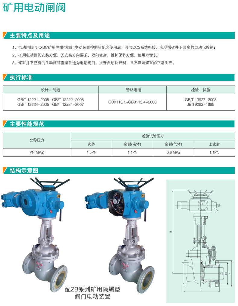矿用防爆电动闸阀的性能符合JB/T8528-1997<普通型阀门电动装置技术条件>的规定。防爆型的性能符合GB3836.1-2000<爆炸性环境用防爆电气设备通用要求>及JB/T8529-1997<隔爆型阀门电动装置技术条件>的规定。并经国家防爆电气产品测试中心检定,取得了防爆合格证。