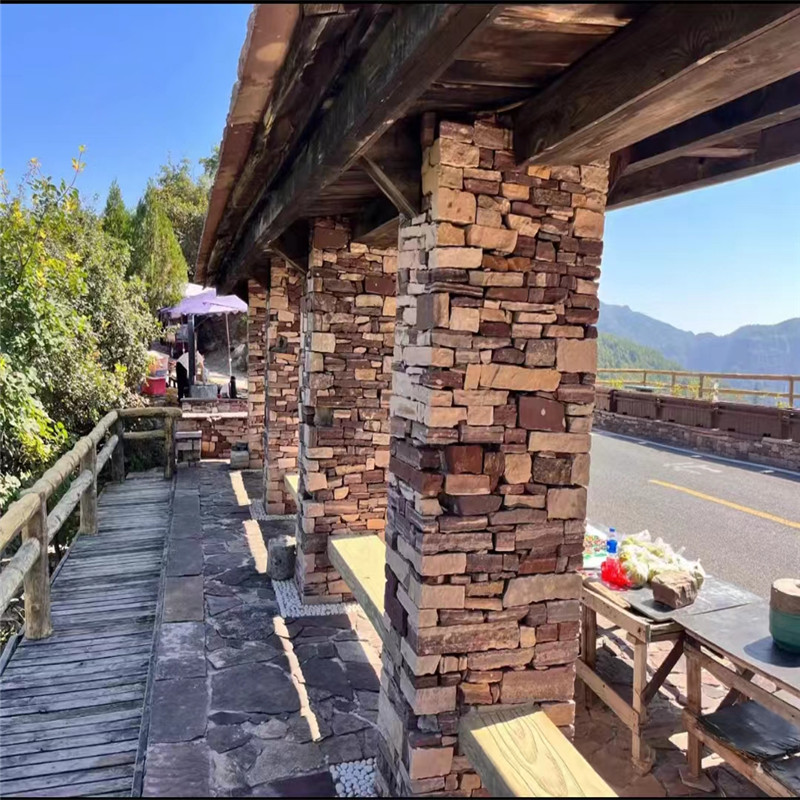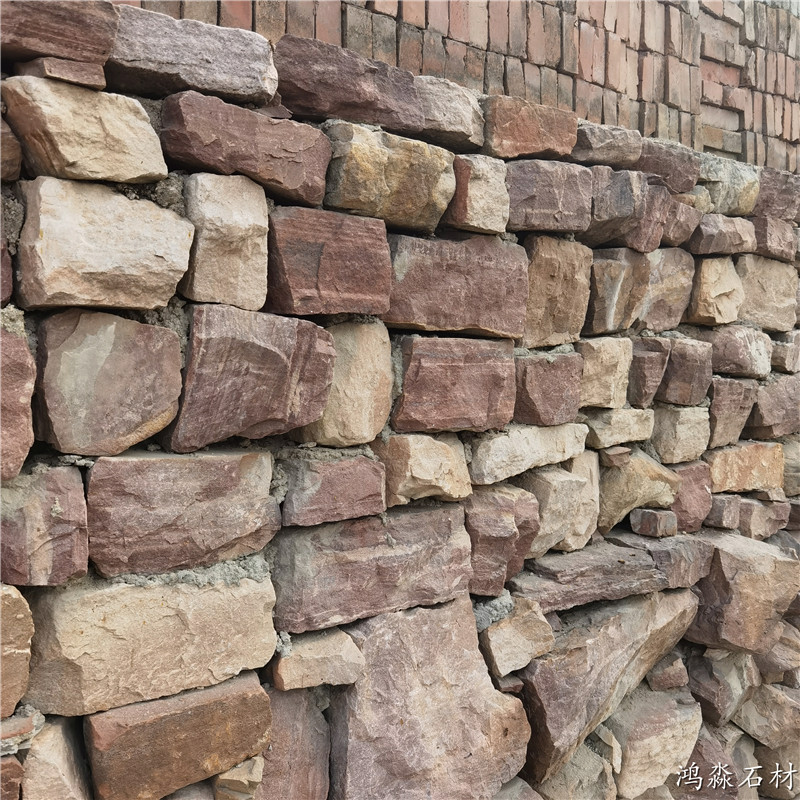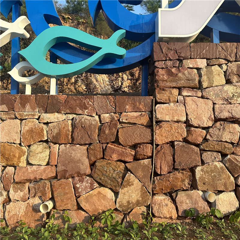 适用场景聚焦于营造乡土与人文氛围。乡村民宿外墙用高粱红砌墙石砌筑,搭配灰瓦、木窗与玉米囤等农俗装饰,还原北方乡村的质朴风貌,红色墙体在白雪映衬下更显生机;中式庭院的围墙选用高粱红砌墙石,与月洞门、竹篱笆组合,红色与青色的对比强化传统园林的色彩韵律,墙面攀爬的牵牛花更添野趣。现代景观中,可将其与混凝土、玻璃等材料结合,如用高粱红砌墙石砌筑花池边框,搭配不锈钢水景装置,通过材质碰撞平衡乡土与现代感;文化广场的背景墙用其拼砌出简化的高粱穗图案,强化地域农业文化符号,唤起观者的情感共鸣。