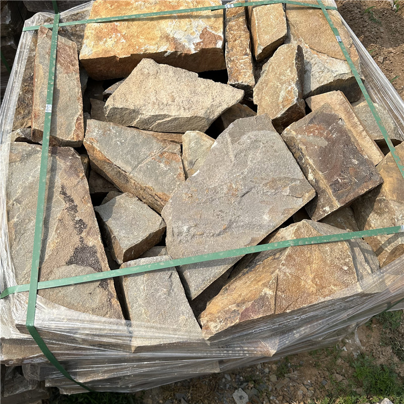 从应用场景与风格适配来看,黄锈色块石的兼容性极强,能轻松驾驭多种装饰风格。在户外景观中,它是造景的核心元素:用其铺设庭院步道,搭配绿植与水景,黄锈色与自然绿意形成鲜明对比,营造出 “山野林间” 的惬意氛围;垒砌花坛边缘、假山基底或水景驳岸,块状石材的稳固性与锈色的自然感相得益彰,让景观更显质朴厚重。在建筑外墙装饰中,黄锈色块石常用于别墅、民宿或乡村风格建筑的外墙铺贴,可采用 “乱拼” 或 “规则排列” 两种方式 —— 乱拼能凸显原始粗犷的质感,搭配木质窗框与灰色瓦片,还原乡村田园风;规则排列则更显整洁有序,与现代简约建筑的线条感融合,平衡自然与时尚。在室内装饰中,它的用法更为精致:可作为客厅电视背景墙的局部点缀,与浅灰乳胶漆墙面、原木家具搭配,用锈色纹理打破空间的单调;切割成小块铺贴于玄关地面或厨房防溅墙,既能提升细节质感,又能通过防滑特性保障使用安全。
