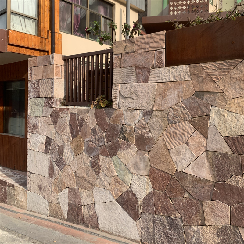 红色铺路石 装饰地面 粉砂岩蘑菇石 高粱红冰裂纹碎拼石因拼接后呈现如同冰封湖面开裂的自然纹路而得名,是一种以天然石材破碎加工为核心的装饰材料,兼具不规则的野性与韵律感,成为中式园林与现代设计中营造灵动氛围的特色元素。其原料多选用青石板、板岩或花岗岩,经人工劈裂或自然风化形成大小不一的碎块,单块形态多为多边形,边缘锐利如冰棱,拼接后通过石块的交错咬合,勾勒出纵横交错的裂纹效果,既保留了石材的坚硬质感,又传递出自然造物的随机之美。