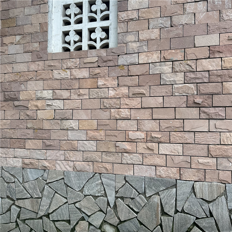 装饰应用上,粉砂岩蘑菇石的柔和色调使其适配多种风格:在法式乡村庭院中,用它砌筑矮墙或花池边缘,搭配白色铁艺栅栏与薰衣草花丛,粉色石材与紫色花卉形成浪漫呼应;新中式园林的小径旁,粉砂岩蘑菇石点缀于青苔间,与青石板汀步、翠竹组合,诠释 “雅致清幽” 的东方意境;室内玄关背景墙采用小规格蘑菇石拼贴,与原木置物架、米色布艺搭配,通过柔和的粉调与凹凸肌理,消解空间的生硬感。需避开厨房、卫生间等油污、潮湿区域,以防污染难以清理。