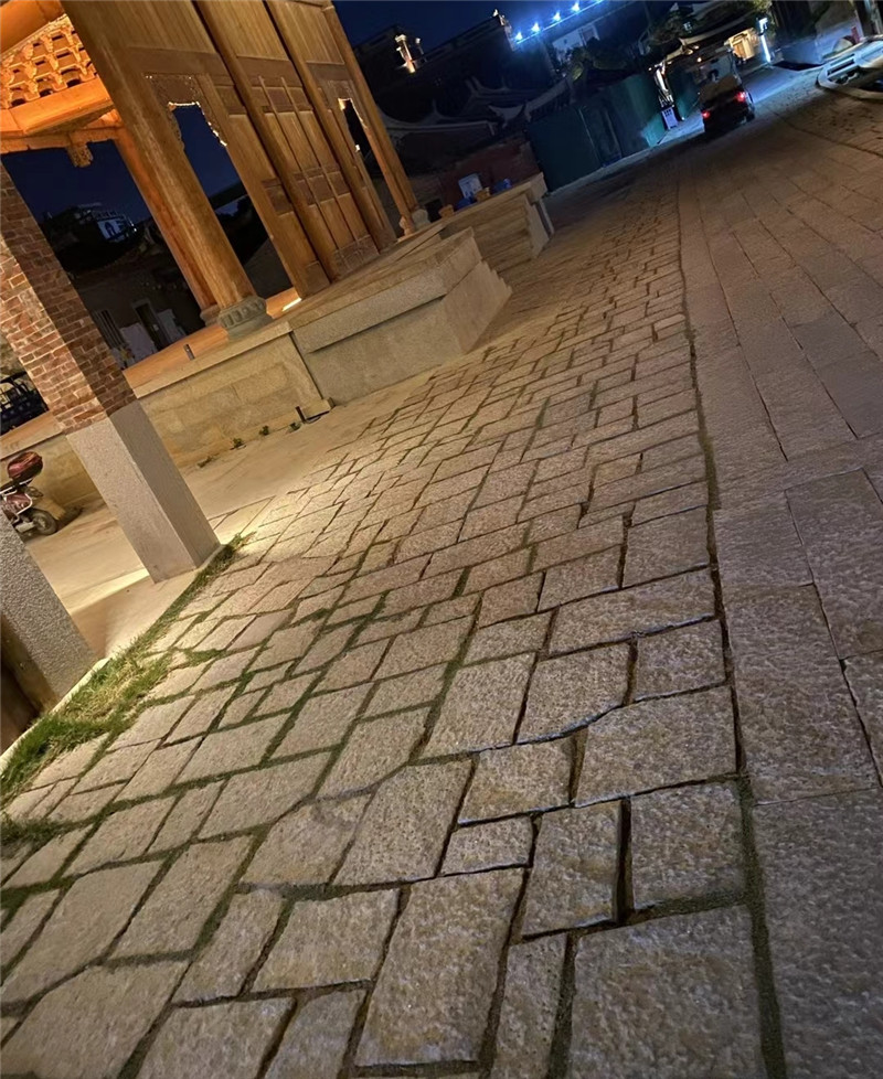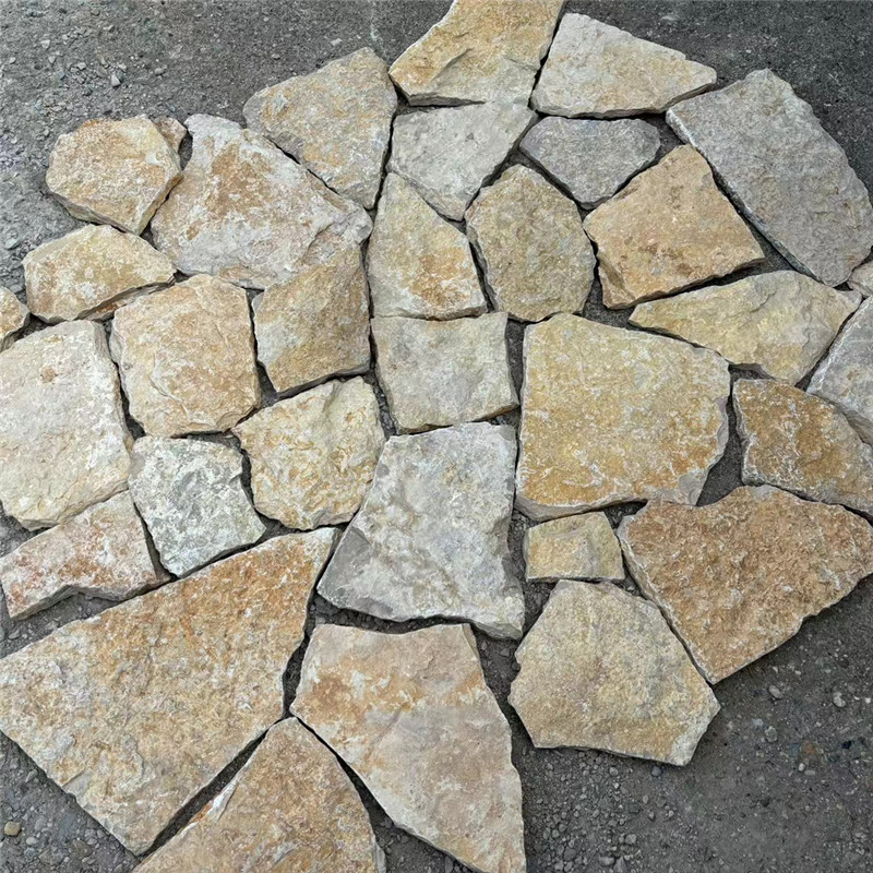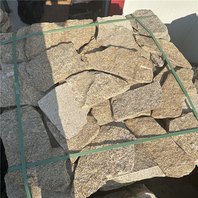 不规则虎皮黄碎拼石 天然蘑菇石 商场墙面 黄锈石乱拼文化石以黄色为基调,呈现出温暖明亮的黄色调,色泽自然天成,且带有锈色斑点,锈点清晰,多锈点且分布均匀的黄锈石乱拼文化石被视为品质上乘。纹理多样,有的细腻,有的粗犷,无规则的纹理使得每一块石材都独具特色,组合拼接后能形成自然而富有变化的图案,营造出独特的视觉效果。属于不规则的多边形片石石材,没有固定的形状和尺寸,无规则铺设,组合后从视觉上类似于冰裂纹,但又更具不规则性,能为空间增添自然、随性的感觉。黄锈石属于花岗岩,石质坚硬,抗压强度和抗弯强度较高,不易断裂,耐磨性强,能够承受一定的压力和摩擦,适用于多种场所的装修。具有较低的吸水率,能够有效防止水分渗透,抵御水的侵蚀,不易因潮湿而产生变形、变色等问题,在户外环境中也能保持较好的稳定性。