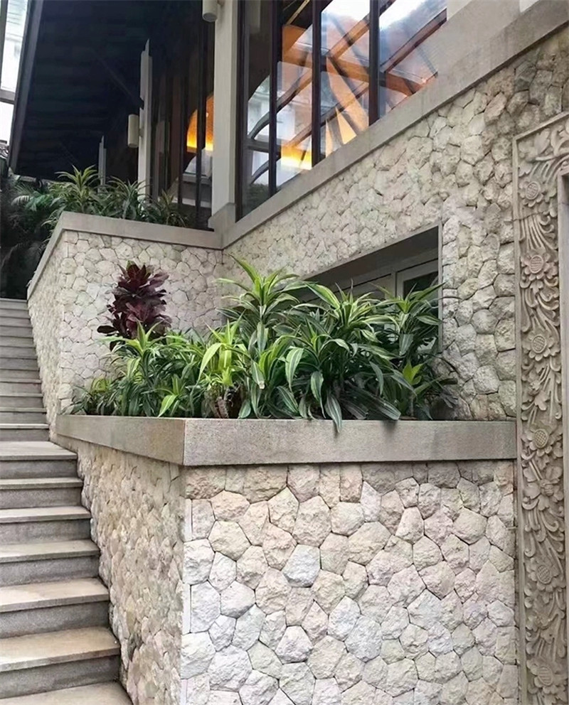 在物理特性上,白色莱姆石质地相对轻盈,密度适中,相较于花岗岩等硬质石材更便于切割与安装。虽硬度稍逊,但耐磨性与抗压性良好,能满足墙面、地面等多种装饰需求。其独特的多孔结构使其具备一定的透气性与吸水性,可调节局部湿度,在潮湿环境中有效防止水汽积聚;同时,莱姆石的抗风化、耐腐蚀性能突出,即便长期暴露在户外,也不易褪色、变形,能够长久保持美观,且日常维护只需定期清洁,无需特殊护理。