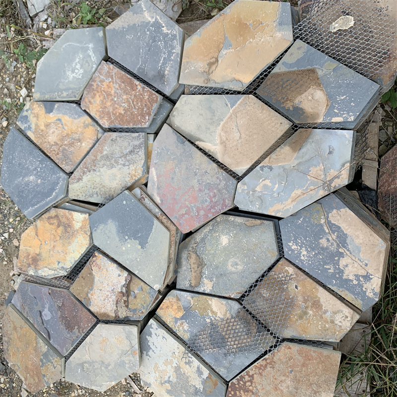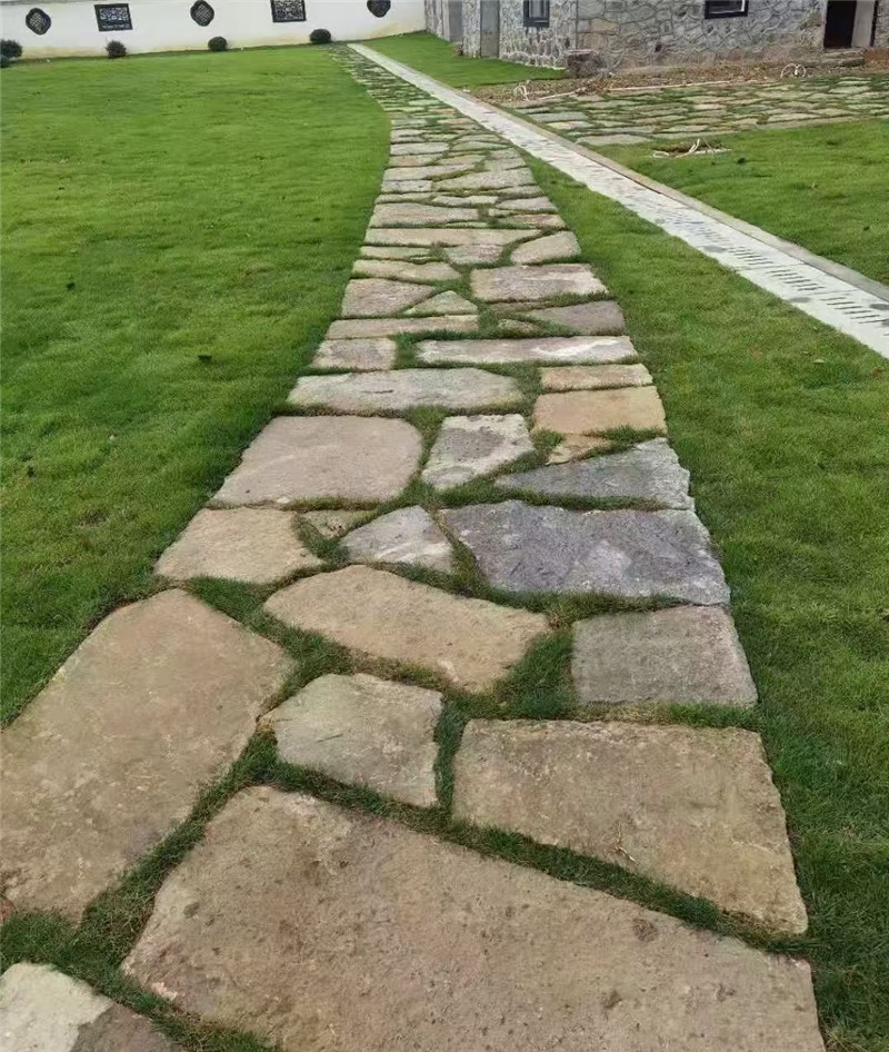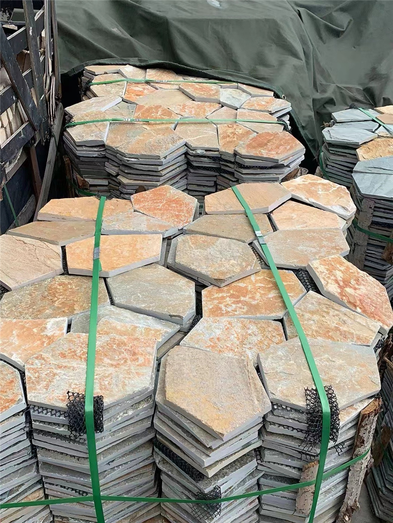 在空间应用中,黄锈石碎拼石的铺砌方式赋予空间不同的气质。园林中常用 “冰裂纹” 拼法,碎块间的缝隙宽窄不一,如同湖面结冰后的自然裂纹,与周边的草坪、水景、绿植搭配,行走其上仿佛踏过山间的天然石径,锈黄色的石面在绿色背景中格外醒目却不突兀;日式庭院则偏爱 “散点式” 铺设,将大小不一的黄锈石碎块随意嵌入碎石垫层,石面与地面平齐,缝隙间长满青苔,营造出 “枯山水” 的禅意,锈色与苔藓的青绿色形成古朴的色彩对话。