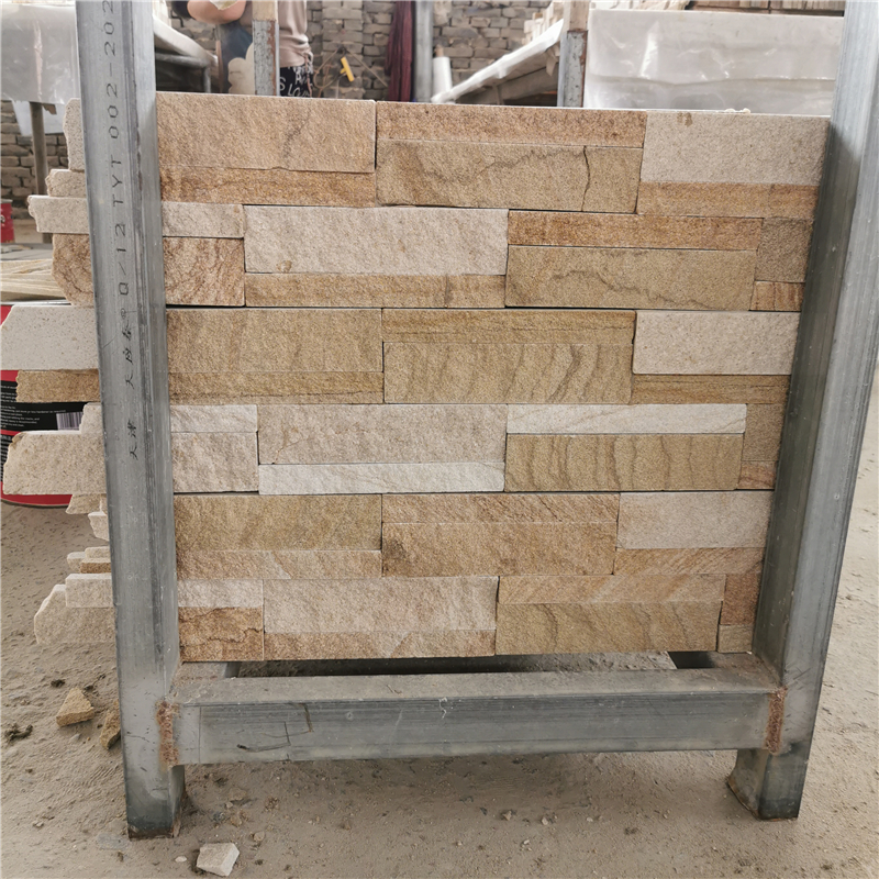 墙面贴片石 自然惬意 黄锈石冰裂纹碎拼 黄河砂岩文化石是一种以天然黄砂岩为原料,经切割、凿刻等工艺加工而成的装饰石材,因呈现温暖的浅黄至深褐黄色调而得名,其色泽源于矿石中 2%-5% 的氧化铁与黏土矿物混合,纹理中常夹杂着浅色石英砂粒或深色岩脉,形成如同沙漠沙丘般的自然渐变,表面经处理后可呈现斧剁面的粗犷、荔枝面的颗粒感或哑光面的温润,单块尺寸多在 15-30cm,适配多种装饰风格。