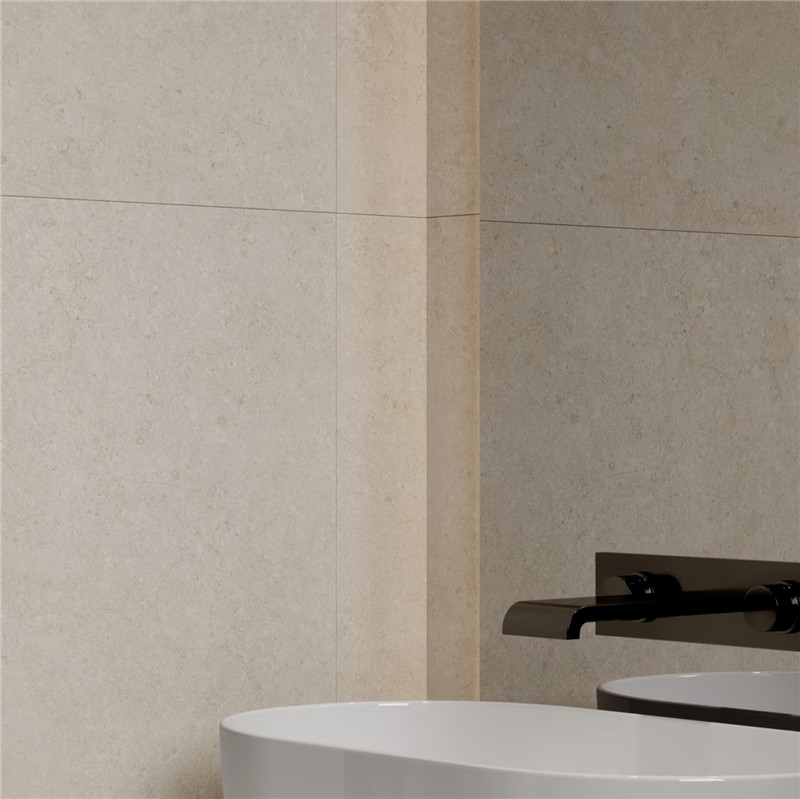 外观特点:白色莱姆石的色调从象ya白、乳白到米白渐变,纯净中带着细微的暖黄底色,避免了冷白的疏离感。光线照射时,它呈现柔和的漫反射,让空间明亮却不刺眼。其表面分布着细密的针孔与浅淡的层理纹,有的如流云般舒展,有的似水纹般蜿蜒,部分石材还带有浅灰或浅褐的化石斑点,为纯白的底色增添了丰富的层次。
