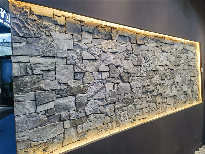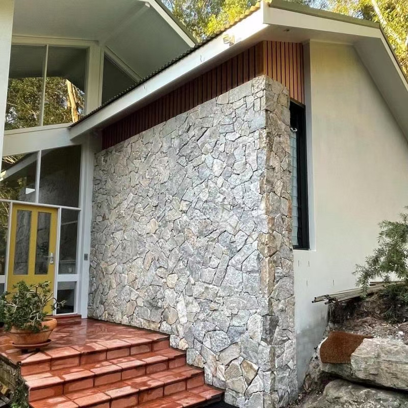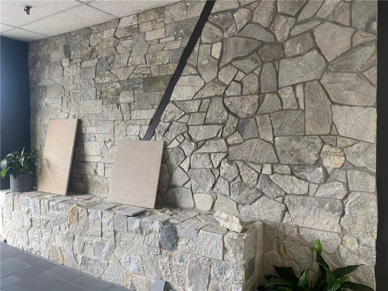 搭配技巧与养护要点是让灰色碎拼石 “出彩不踩雷” 的关键。搭配上,需遵循 “色调平衡” 与 “材质和谐” 原则:色调上,灰色碎拼石可与白色、原木色、绿色自由组合,例如浅灰色碎拼石墙面前摆放白色布艺沙发,地面铺原木色地板,软装选择绿色植物,通过中性色与自然色平衡灰色的冷感,让空间更显和谐;若想强化高级感,可搭配少量铜色、香槟金金属元素(如灯具、摆件),金属的精致能中和石材的粗犷;若想凸显野趣,可搭配藤编、粗陶等原生态材质。排版与缝隙处理上,铺贴时需让碎块大小均匀分布,避免某区域集中大块或小块石材,确保肌理过渡自然;缝隙宽度建议控制在 3-5mm,户外可用细砂填充以还原自然场景,室内则用同色系或浅灰色勾缝剂,防止积灰;若追求更强烈的自然感,可保留部分缝隙不填充,让苔藓自然生长,进一步强化氛围。
