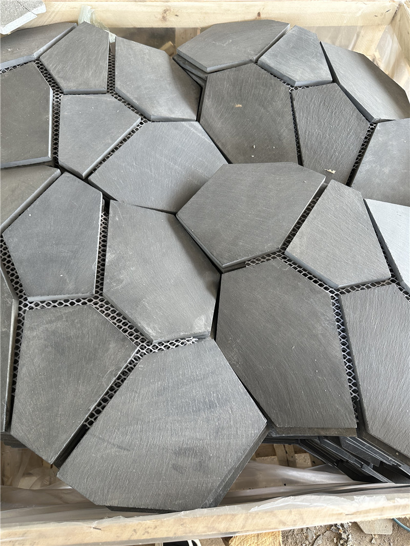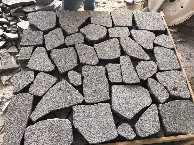 从材质分类来看,灰色碎拼石的核心优势在于 “多元材质适配” 与 “灰色调统一性” 的双重加持。常见材质涵盖三大类:花岗岩类(如芝麻灰、珍珠灰)硬度高(莫氏硬度 6-7 级)、耐候性强,表面带细微晶体颗粒,色调从浅灰到深灰过渡自然,适合户外高频使用场景;砂岩类(如灰砂岩)质地温润,表面带砂质层理纹,触感柔和,灰色中透着轻微暖调,适配室内温馨空间;板岩类(如灰板岩)层理分明,表面光滑却不失粗糙感,色调多为均匀中灰,适合营造禅意氛围。无论哪种材质,加工成碎拼石后,单块尺寸多为 5-20cm,边缘保留石材自然的断裂毛糙感,拼接后形成无固定规律却透着秩序感的肌理,既强化视觉层次,又避免纯色石材的单调,且灰色调自带 “低饱和百搭属性”,能轻松融入各类设计风格。