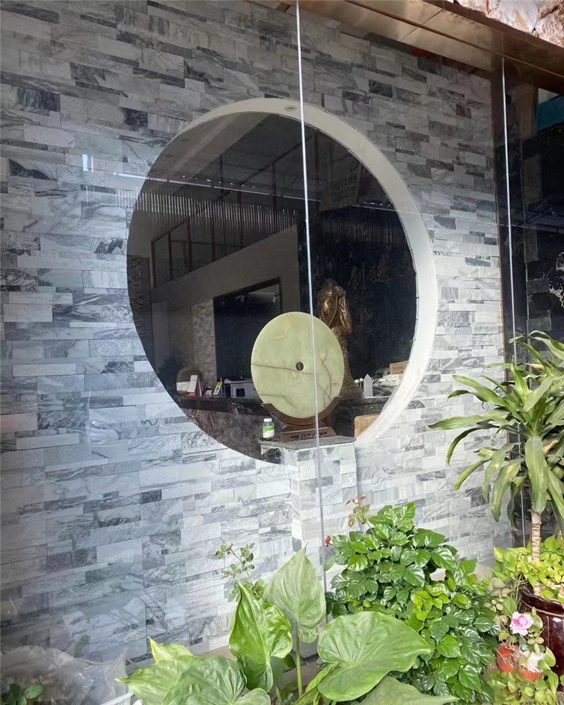 场景应用中,灰色碎拼石的 “百搭属性” 与 “肌理优势” 可针对性发挥,覆盖室内外多元需求。户外场景里,庭院步道用浅灰色碎拼石铺设,缝隙填充浅灰色细砂或苔藓,与周边的青绿草坪、木质花架、潺潺流水形成对比,行走时仿佛踏在 “山野间的灰色石径”,增添景观的互动趣味;水景驳岸用中灰色碎拼石垒砌,石材的耐水性与灰色调让驳岸与水面自然融合,流水沿碎块边缘流淌,营造出 “清泉石上流” 的灵动画面,比混凝土驳岸更显生态雅致;公园休闲区地面用深灰色碎拼石与浅灰色透水砖交替铺设,形成 “深浅对比” 的几何图案,既提升辨识度,又增强透水性能,缓解城市内涝。室内场景中,客厅电视背景墙用浅灰色砂岩碎拼石局部铺贴,中间预留白色乳胶漆区域挂简约装饰画,两侧搭配原木置物架,碎拼肌理让背景墙在简洁中透着细节层次,避免纯色墙面的平淡;卧室床头背景墙选择小块中灰色碎拼石拼接,搭配暖光壁灯,柔和光线沿石材肌理漫射,弱化灰色的冷硬,营造出 “温馨自然” 的睡眠氛围;玄关地面用深灰色花岗岩碎拼石拼出几何图案,与浅灰色大理石过渡,形成 “视觉引导”,让进门区域更显独特,传递出高级归家感。