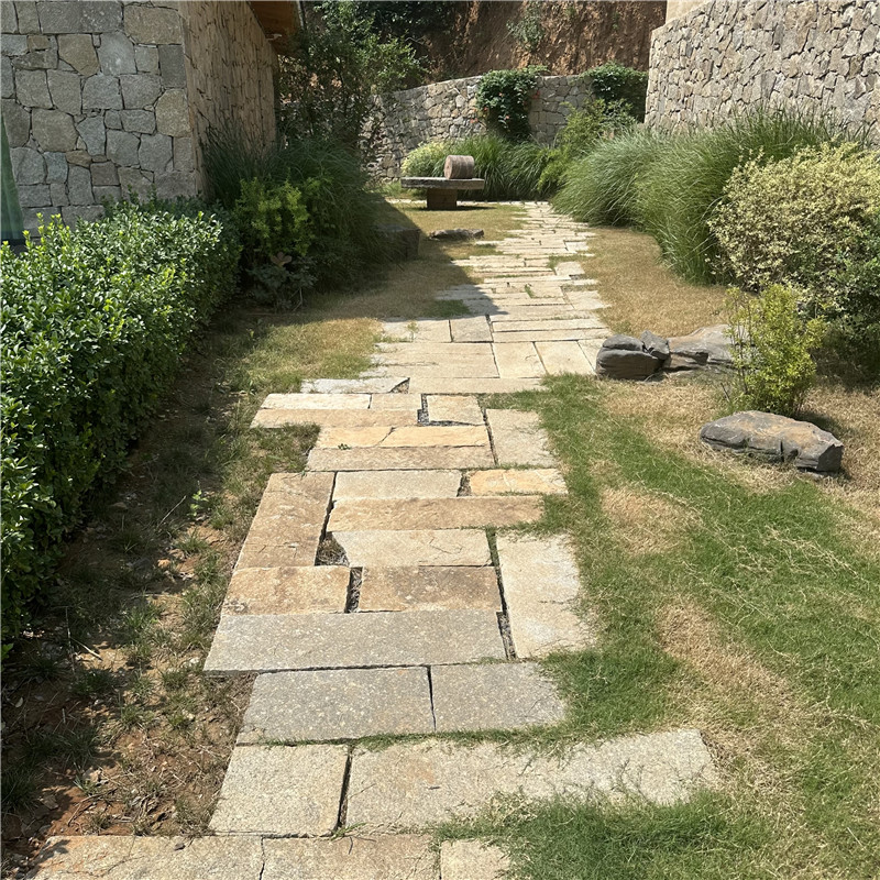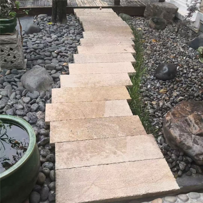 在场景应用中,黄砂岩条石能凭借暖调质感适配多样空间。室外场景里,它是打造自然庭院的理想选择:可用于庭院步道铺设,选用 600×150mm 规格的浅米黄砂岩条石,按 “纵向排列” 方式铺贴,缝隙用浅灰色细砂填充,搭配原木汀步与向日葵、薰衣草等暖调花卉,暖黄石材与绿植相映,营造 “乡村田园” 的惬意氛围;也可用于别墅外墙腰线或窗套装饰,采用焦糖黄土黄砂岩条石,与浅米色外墙涂料搭配,条石的规整线条提升建筑立面的精致感,同时暖调与自然环境和谐相融,适合乡村民宿、田园风别墅的室外装饰。