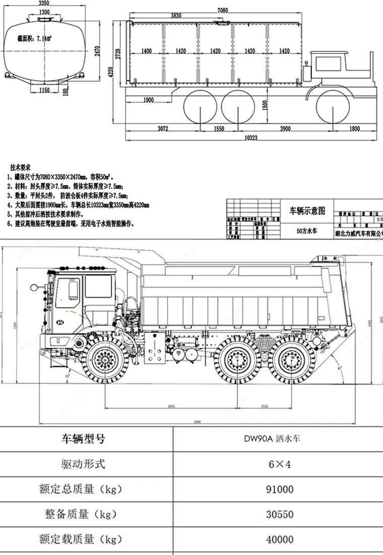 柳汽宽体矿用50方洒水车工作时间及范围参数: