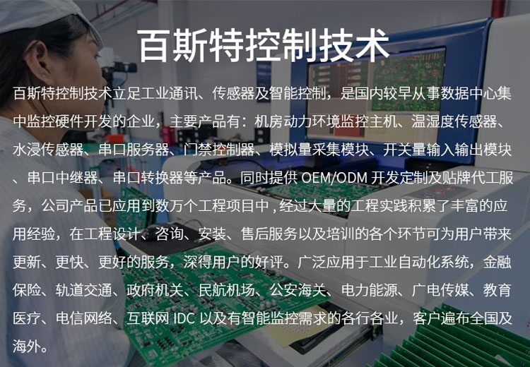 深圳百斯特控制技术致力于机房动环监控主机,新能源通讯管理主机,工业通讯IO模块的研发和生产。广泛应用于工业自动化系统,工商业储能、 充电桩、、轨道交通、民航机场、海关、电力能源、广电传媒、教育医疗、电信网络、互联网IDC以及有智能监控需求的各行各业,客户遍布全国及海外。