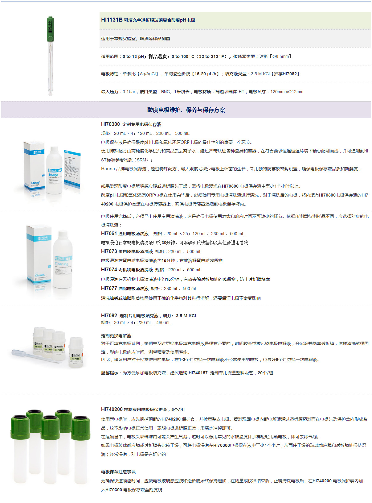 HANNA HI1131B 可填充单透析膜玻璃复合酸度pH电极