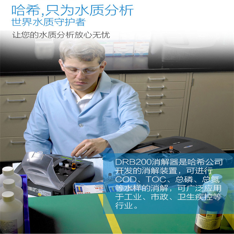 产品介绍:DRB200 COD消解器/消解仪是哈希公司新近开发的消解装置,可进行COD、TOC、总磷、总氮等水样的消解。消解时间及消解温度可分别在0-480分钟、37-165℃的范围内选择。 为了满足更广泛的使用需求,可在DRB200 COD消解器中配置一个加热块或两个独立的加热块,在不同/相同温度和不同/相同时间设定条件下,能够进行两个独立加热控制模块的消解。加热块中的消具有3种尺寸规格,分别适用于带条形码的plus预制试剂(13mm)、普通的预装管(16mm)以及金属消解预处理的预装管(20mm)。