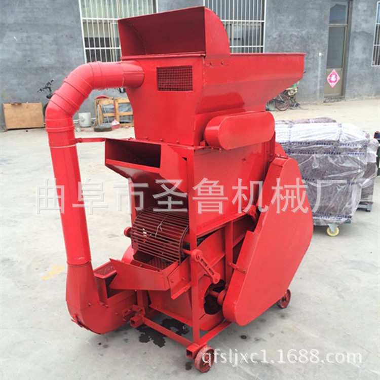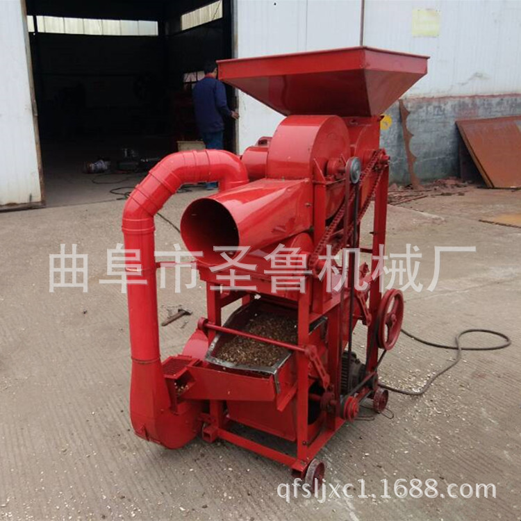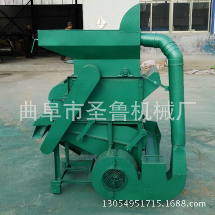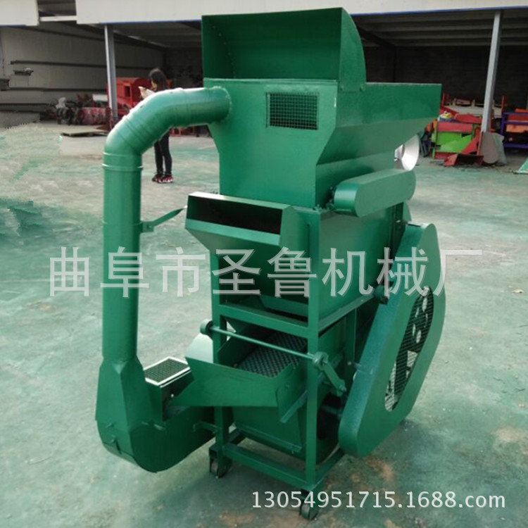 工作原理:花生果由人工喂料,先落到粗文栅里,由于文板转动与固定栅条凹板间的搓力,将花生壳剥离分离后的花生仁与壳同时经过栅网落下,再通过风道过由风力将大部分花生壳吹击机外,而花生仁和一部分尚未剥离的花生小果一起落入比重分选筛,经过重筛选后,花生仁由分离筛面上行,通过料口流入麻袋,而尚未剥离的花生(小果),则由筛面下行,经过出料道口流入提升机,再由提升机送入细纹栅进行二次剥壳,再经过比重分行筛分选,即可达到全部剥离。