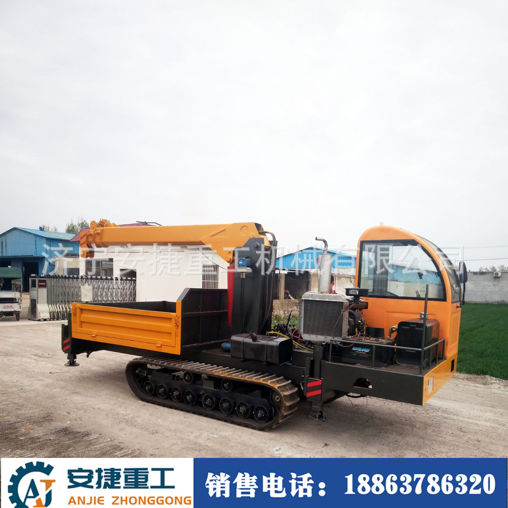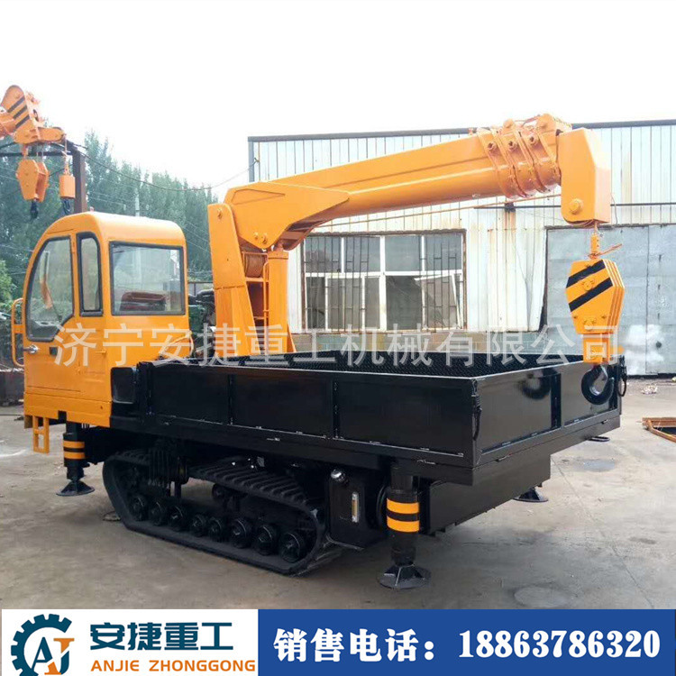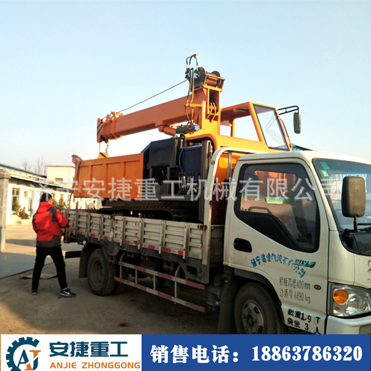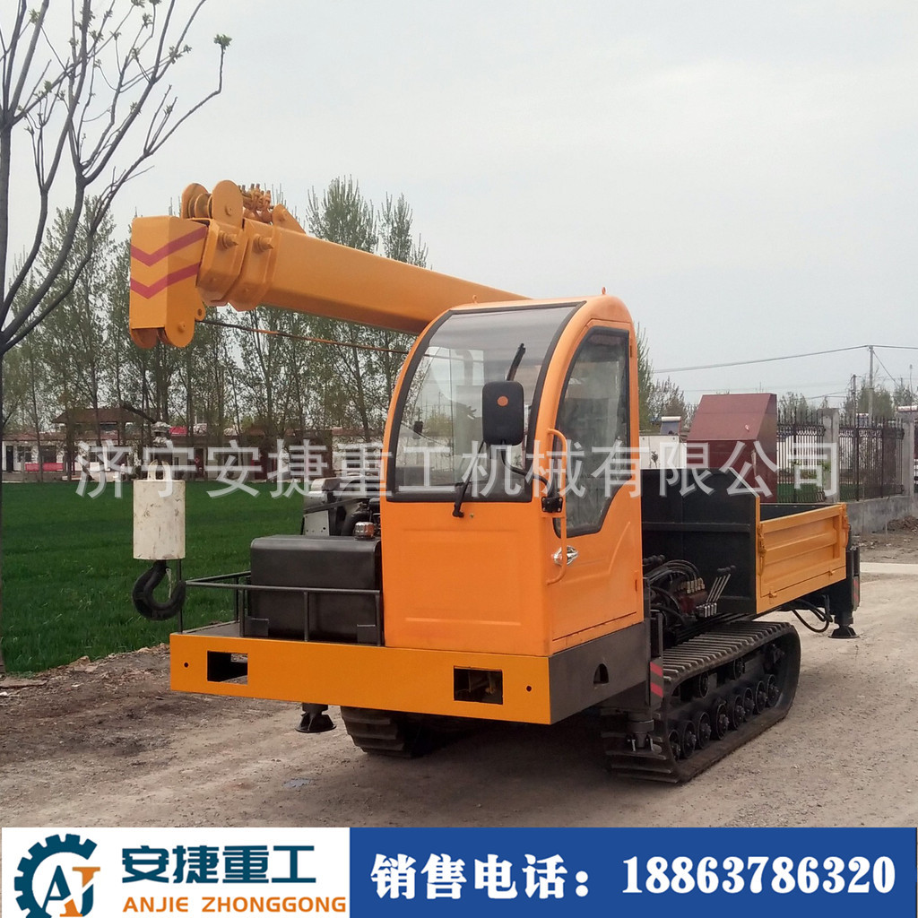 随车吊履带式运输车能适应水田地、沼泽地、泥泞的田间道路、崎岖的山路、松软的草地和沙漠、湿滑的冰面和雪地等复杂恶劣路况,在农林果园运输货场装载、水利建设、基建工程、矿山场等地应用广泛。