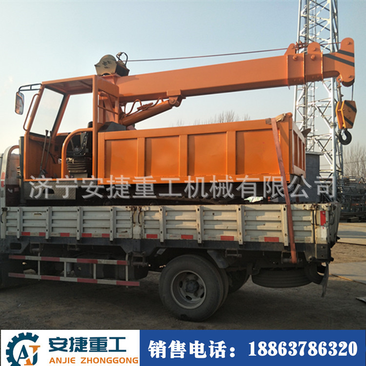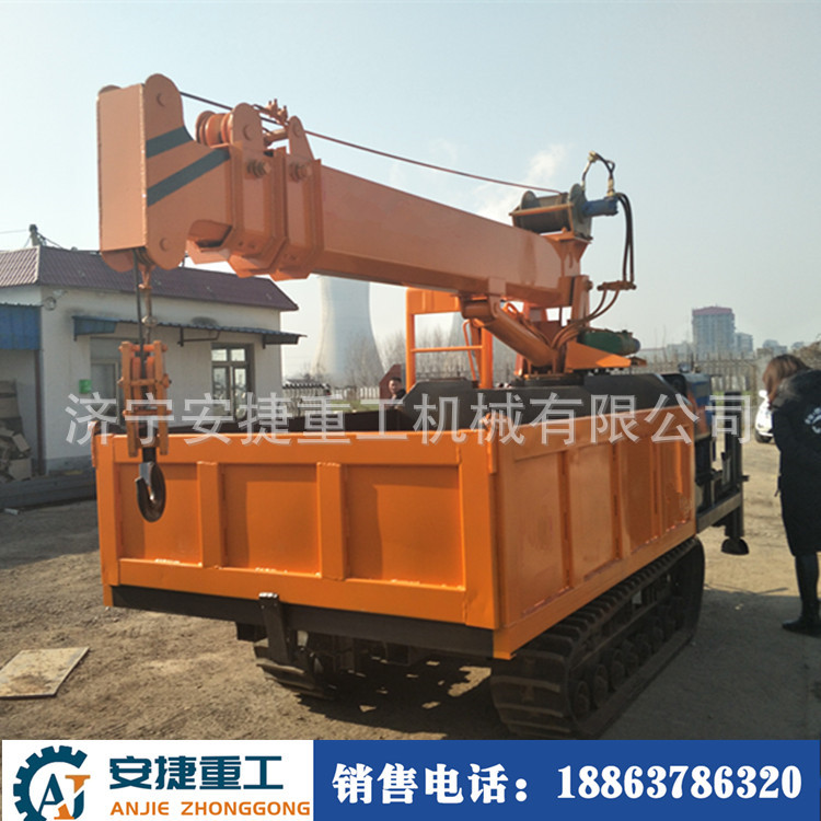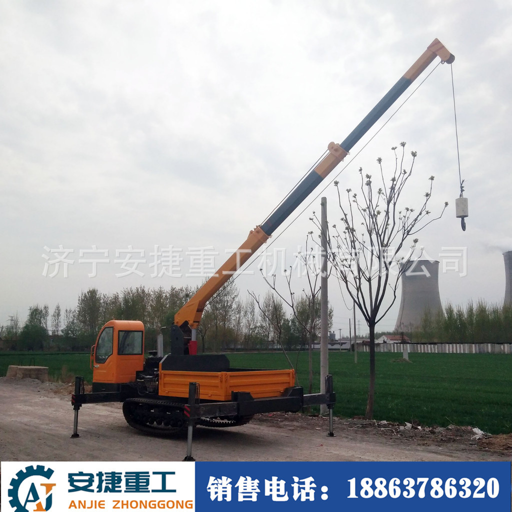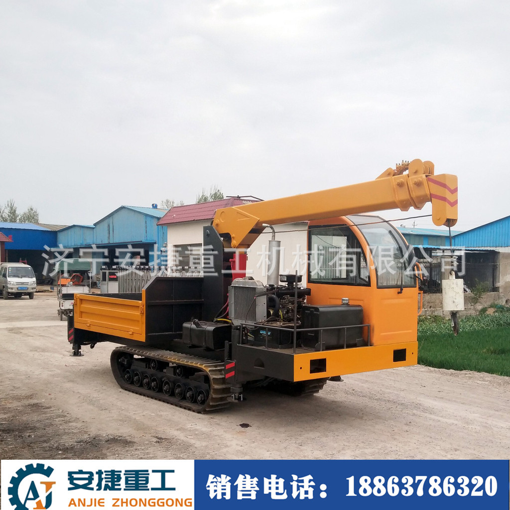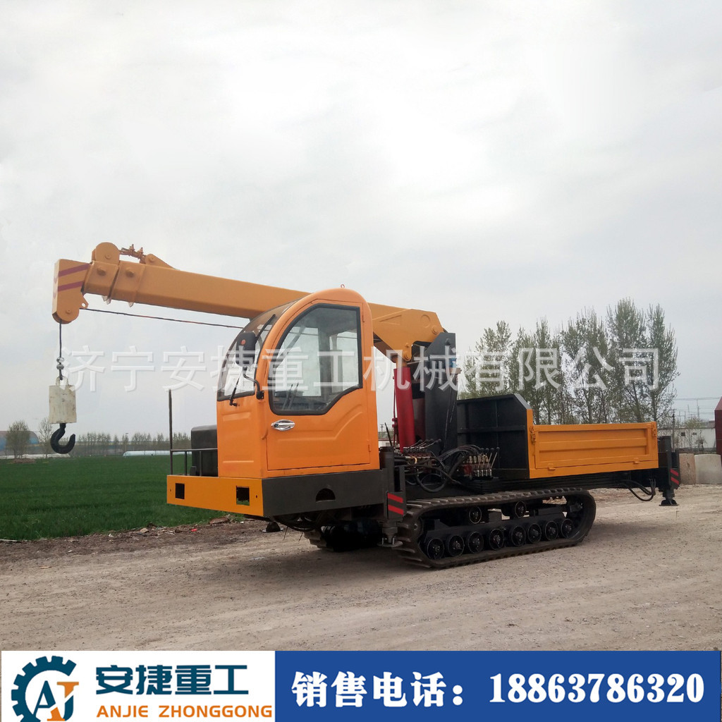 随车吊履带式运输车能适应水田地、沼泽地、泥泞的田间道路、崎岖的山路、松软的草地和沙漠、湿滑的冰面和雪地等复杂恶劣路况,在农林果园运输货场装载、水利建设、基建工程、矿山场等地应用广泛。