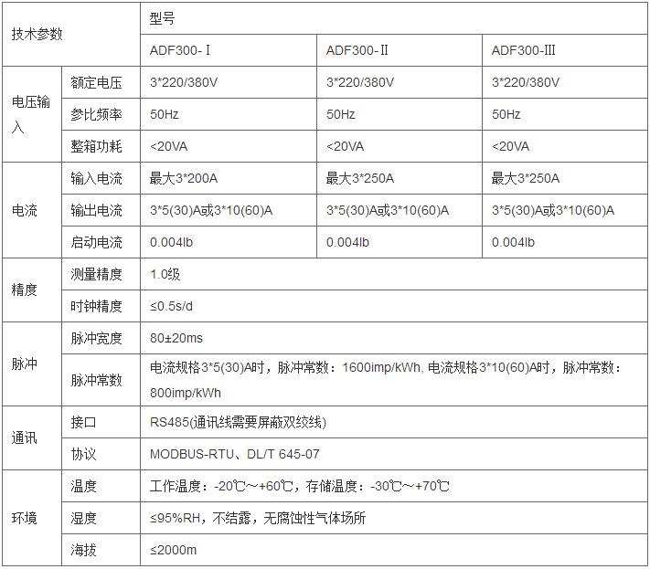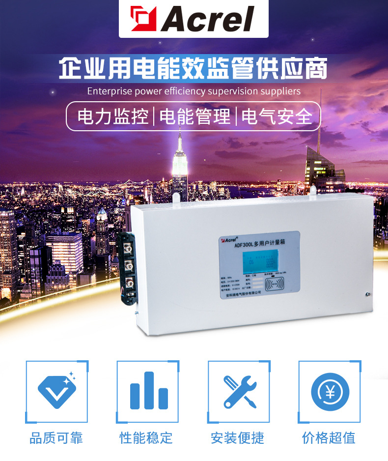 功能:ADF300系列多用户计量箱是一种电子式智能化多用户电能表,设计采用一户一计量方案,具有计量准确度高、户与户之间计量互不干扰、集中安装、集中管理优势。可以同时计量12户三相、36户单相、单/三相回路混合用电状况。 应用范围:适用于企业、居民小区、学生公寓、旧楼改造、高层建筑用电管理。 订货范例:具体型号:ADF300-Ⅲ-5S12DY技术要求:5路三相+12路单相(预付费型)通讯协议:RS485接口 DL/T645规约辅助电源:无