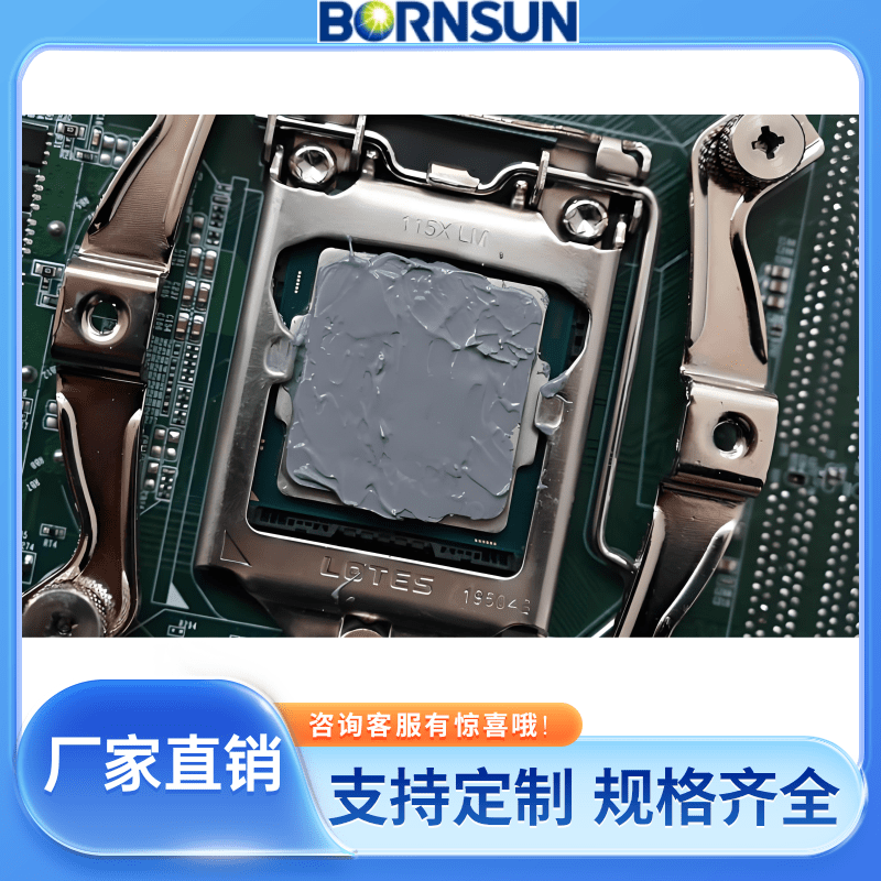 深圳市博恩新材料股份有限公司的导热硅脂产品特点总结如下: 1. 高导热性能 博恩新材料的导热硅脂采用高纯度填料和优化配方,导热系数可达3.0~12.0 W/(m·K),显著提升热量传递效率。其低热阻特性能够快速填充发热体与散热器间的微隙,有效降低电子设备的工作温度,适用于CPU、GPU等高功率场景。通过纳米技术增强界面接触,确保长期稳定性,避免因热循环导致的性能衰减。 2. 优异的电气绝缘性 产品具备出色的介电强度(≥15 kV/mm)和体积电阻率(≥1×101? Ω·cm),有效防止短路风险。硅油基体系与无机填料的结合,既保障了绝缘安全,又兼顾导热需求,特别适用于新能源汽车电池、光伏逆变器等高压环境。通过UL、RoHS等认证,满足严苛的工业可靠性标准。 3. 耐候性与长寿命 博恩导热硅脂在 50℃~200℃宽温域内保持性能稳定,抗老化性强,无析油或干裂问题。特殊改性硅树脂配方可抵抗湿热、盐雾及振动冲击,适用于户外通信基站、工业设备等恶劣工况。部分型号支持10年以上使用寿命,大幅降低维护成本,是长效热管理解决方案的理想选择。